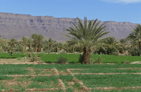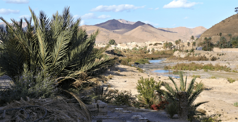Langzaam dalen we in de canyon af totdat we bij het oasedorpje Targa Oukhdair komen. De rivierbedding draait in een scherpe bocht om het dorpje heen en met open mond bekijken we al dit schoons.