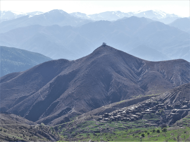 Zodra we van de RN 15 af zijn, begint het flink te stijgen. Mooie bergen met grillige vormen en kleuraccenten. Dan komen we op een hoogvlakte op ruim 1500 m hoogte. Overal zijn er huizen en akkers en soms komen we een plaatsje tegen. Als we voorbij Imouzzèr-des-Marmouch komen, moeten we op zoek naar een bivakplaats. Dat is hier nog niet zo gemakkelijk. Het liefst sta je uit het zicht van de weg en bewoners. Helaas gaat dat niet lukken. Wel vinden we net over een col naast de weg een mooi plat stukje. Het uitzicht op de volgende vallei is weer mooi genoeg om van te genieten en dus installeren we ons. Eerst maar eens bijkomen van de toer met een kopje koffie en met de zonnestralen op ons gezicht. Zodra de zon achter de bergen is verdwenen, verhuizen we naar binnen en koken een gevulde soep die ons heerlijk smaakt.