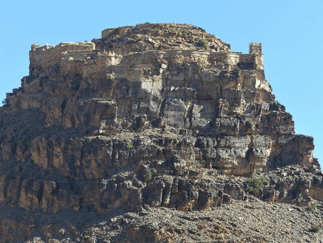 We vervolgen de rit over de piste, rijden uit de kloof een kale open vlakte in en vinden uiteindelijk het plaatsje Amtoudi. Het ligt tegen een bergketen aan en na enig speuren zien we het fort op een bergpunt liggen. Het is best nog een eind weg en dus willen we er dichterbij komen. Jeroen draait de auto, kijkt niet goed in z’n spiegels en komt met het reservewiel aan de achterkant tegen een muurtje aan. Gevolg: een deuk in de achterdeur (zucht). We rijden het dorpje in over een zeer steile en beroerde weg. Het lijkt of de weg recentelijk is weggespoeld en zien een bordje dat het restaurant open is. We hebben zin in koffie en we hoeven alleen maar even aan te bellen.