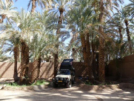 De piste gaat vlak langs de hoge duinenrij en het zand is zacht en diep. Jeroen laat nog eens extra lucht uit de banden. De Toy moet dus weer flink aan het werk en doet dat uiteraard voortreffelijk. Het is even zoeken naar een doorsteek naar een andere piste en na wat heen en weer rijden schieten we een duin over en zien gelukkig de beoogde piste liggen. Deze piste is veel harder van ondergrond en in een vlot tempo rijden we richting Erfoud. Voor de asfaltweg pompen we de banden weer op naar normale druk. Bij camping Chez Karla vinden we een plekje onder de palmbomen en kunnen we bijkomen van een werkelijk schitterende driedaagse tocht door de woestijn.