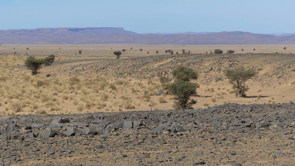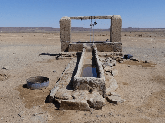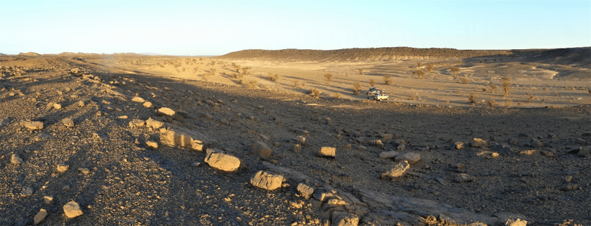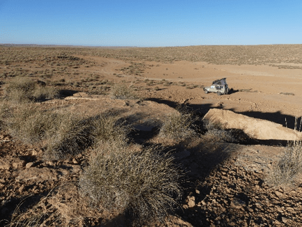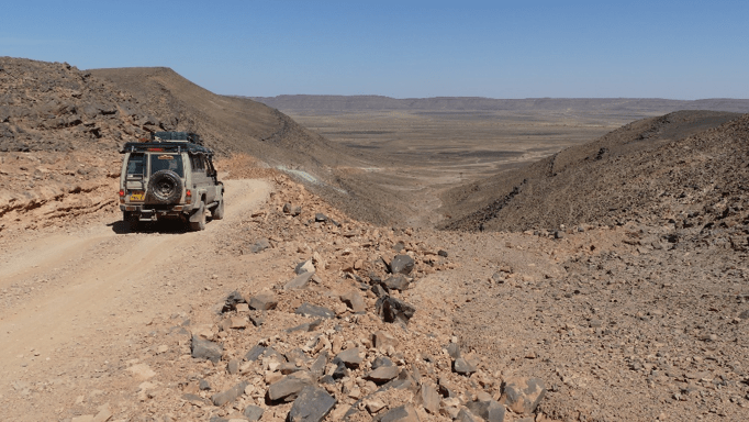 Het is een stenige piste over een uitgestrekte rotsige vlakte met in de verte een bergkam waar we op af rijden. We kruipen over de bergkam, omdat de piste slecht is en zien bovenop de col twee Landrovers staan. Het zijn Duitsers die een koffiepauze houden en daar hebben ze een mooi plekje voor uitgekozen. In de afdaling zien we een zanderige vlakte voor ons en een waterput. Dat lijkt ons een mooie plek voor onze koffiestop. De Duitsers rijden ons zwaaiend voorbij. De steenpiste heeft plaats gemaakt voor een meer gemixte ondergrond. We laten een enorme stofwolk achter ons en soms staat de auto vol stof als we door een mul gedeelte rijden. We draaien dan de ramen open om even door te luchten, maar het dashboard heeft intussen een geeloranje zandkleur. Het landschap verandert niet veel, het blijft een uitgestrekte zandvlakte zonder veel reliëf met slechts in de verte wat bergkammen. Er is geen begroeiing, op wat velden kamelengras na.