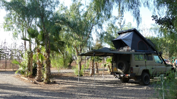 Ina voelt zich niet zo lekker en doet een dutje. Jeroen maakt een simpel diner. Net als hij aan het bord en de wijn zit, horen we een auto naast ons parkeren. Het getoeter is duidelijk een teken om contact met ons te hebben. De gendarmerie staat voor onze deur. “U mag hier niet kamperen, monsieur.” “Oh? Waarom niet?” Hij antwoordt ons dat wild kamperen niet is toegestaan vanwege onze veiligheid. Vorig jaar zijn er twee jonge vrouwen vlak bij Marrakech omgebracht. Een tragisch incident, zowel voor de familie als voor de lokale bevolking. De man is zeer vriendelijk en hij biedt aan om ons naar de camping te begeleiden. Jeroen krijgt zelfs nog 20 minuten om zijn bord leeg te eten. We zeggen dat het ook de bedoeling was om naar de camping te gaan, maar die konden we niet vinden. Als we er aankomen, doet de beheerder het hek met de sleutel open. Nogal logisch dat we het niet hebben kunnen vinden. Het ligt iets van de weg af, het hek op slot en het is er stikdonker. We zijn de enige kampeerders en krijgen een plaats toegewezen. Hartelijk bedanken we de gendarmerie voor de hulp. Vandaag hebben we genoeg meegemaakt en is het nu wel bedtijd.