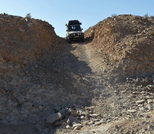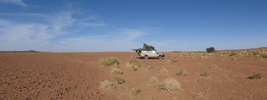 Dat schiet lekker op, maar daarna zakt ons reistempo weer drastisch. Onze voorgenomen route blijkt te zijn afgesloten en we moeten andere sporen volgen die niet op onze routeplanner staan. Na enige tijd weten we niet meer precies waar we zijn en twijfelen tussen de verschillende sporen. We besluiten op het kompas het noorden aan te houden om daar hopelijk weer een bekende piste op te kunnen pakken. Bij het gehucht Feja Kbira lukt dat en pakken we het spoor weer op en vol goede moed rijden we verder tot het moment dat weer onze route met stenen als markering is geblokkeerd. “Dat doen ze vast niet voor niets.” zegt Jeroen. “Laten we maar weer een andere route zoeken.” De ondergrond van de Rekkam lijkt solide door de stenen, maar in werkelijkheid is het losse leem dat zeer eenvoudig wegspoelt bij enige regenval. Hierdoor ontstaan modderstromen die makkelijk de piste wegspoelen. Bovendien ontstaan er oueds met steile oevers en die moeten we voorzichtig oversteken om de boel heel te houden. Aan het einde van de middag vinden we een bivakplek op een klein plateau.