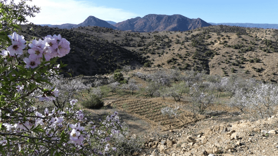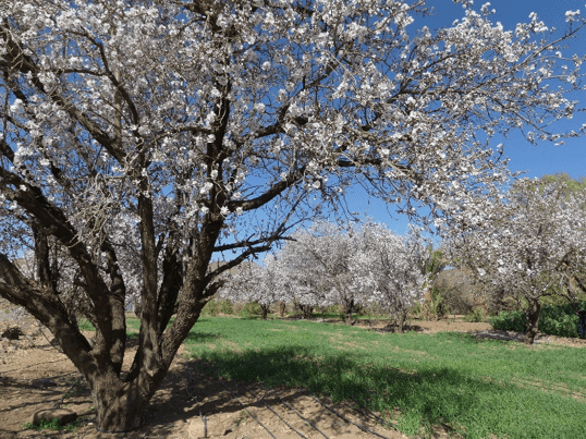 We rijden over de piste en volgens de aanwijzingen slaan we links af. De piste loopt door een kloof, langs een oued met veel water en enorme velden met bloeiende amandelbomen. De witte bloesem en het fel groene gras in de oases steken magnifiek af tegen het zwarte gesteente van de omringende bergen. Dan lijkt de weg over te gaan in een smal oued vol rotsen. We vragen ons af of dat de bedoeling is. Al gauw zien we op de OsMand app dat deze ouedroute nog lang is. We besluiten terug te keren, omdat we niet zeker weten of daarna de piste wordt vervolgd. Niet erg vinden wij. We hebben weer een mooi stukje Marokko gezien. We pakken het begin van de piste op en dan blijkt dat we veel te vroeg linksaf zijn geslagen, waardoor we in de verkeerde vallei zijn terecht gekomen.