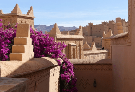 Onze route loopt vandaag van Demnate naar Ouarzazate. Even buiten Demnate stuiten we op Imi-n-Ifri, een natuurlijke brug waar een mooie stroom water onderdoor loopt. Over uitgehakte treden lopen we door dit natuurwondertje. Druppels water komen langs de overhangende rotsen naar beneden en vormen stalagtieten. Het wemelt er van de rondvliegende kraaien. De moeite van een tussenstop zeker waard. De weg klimt verder omhoog en gaat over in een niet al te beste piste. Af en toe passeren we kleine bergdorpjes met terrasbouw en we worden nagestaard door de bewoners. Het landschap wordt weer kaal en we zien in de verte besneeuwde bergtoppen. Op ongeveer 2500 m hoogte hebben we een panoramisch uitzicht op de onderliggende valleien.