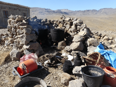 “Heb je koude voeten?”, vraagt Paul aan Ina. “Je kunt ze warmen aan het zand waar de kooltjes onder liggen.” Warme voeten, altijd aangenaam. Bijna roerloos staat ze op het zand. Alleen haar voeten bewegen. Wat een genot! Gezamenlijk ontbijten we. Paul en Jamiaa hebben stoelen waar ze schapenhuiden op leggen. Vooral in de avond is dat behaaglijk. Misschien wel een idee voor ons als we een volgende keer naar Mongolië willen. Je moet je overal op voorbereiden. Hier hebben we het in de nacht niet koud dankzij ons donzen dekbed en deken van dromedarishaar. En voor de extreme kou hebben we ook nog een kruik mee.