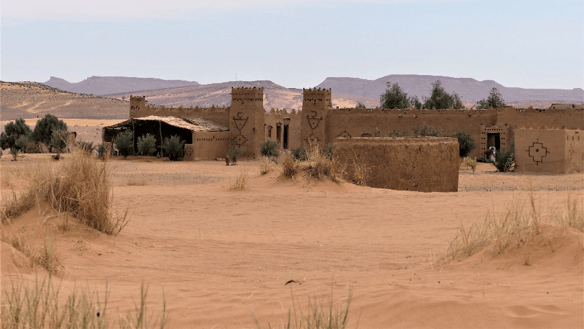 We volgen de zanderige piste verder naar Taouz en we constateren dat we dit deel van de route mooier vinden dan het eerste deel vanaf Zagora dat we gisteren hebben gereden. Reliëf in het landschap spreekt ons meer aan. We zien het oprukkende toerisme ook hier met luxe kampementen voor de woestijntrips die overal volop worden aangeboden. Bij Taouz komen we plotseling op de geasfalteerde weg en laten we de duinen achter ons. In vlot tempo rijden we naar Merzouga en slaan voor het stadje af richting de Erg Chebbi, de bekende duinenrij en de verlaten nederzetting Ghost Town. Ook hier is het toerisme fors toegenomen. Rondom de duinenrij zien we het ene na het andere tentenkamp met witte puntige tenten voor de pure woestijnbeleving. We hopen maar dat iedereen er een goede boterham aan kan verdienen. Wij prijzen onszelf gelukkig met de mogelijkheid om met de eigen auto hier rond te crossen, want dat is toch uniek.