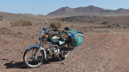 We gaan de Col de Belkassem over en hier is de piste zeer beroerd. Scherpe rotsen vormen een soort treden van een trap en we kruipen in 4laag om de banden te sparen. Alleen met een 4×4 terreinwagen met voldoende bodemspeling is dit te doen. Na de afdaling komen we een oued tegen met roze/rode platte rotsen, een prachtige plek voor een lunch. Als we net zitten te eten, horen we het geluid van een brommer onze kant opkomen. “We krijgen visite.” zegt Ina. Ze heeft gelijk en de man rijdt
