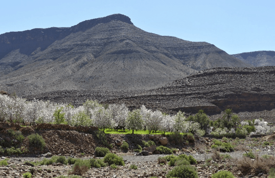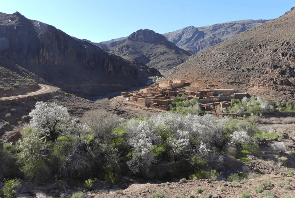 In Taoudacht staan we even in twijfel over de te nemen route. Onder het dorp langs komen we door een amandelboomgaard, vol met roze/witte bloesem. De adem stokt in onze keel bij zoveel schoonheid. Langzaam rijden we naar beneden naar het oued die vol staat met water. Volgens de routeplanner moeten we het oued oversteken, maar er is nergens een spoor te bekennen. Ina springt uit de auto en loopt een stuk stroomafwaarts. Daar ziet ze de uitgang uit het oued en de auto moet dus gewoon door het water. Eenmaal aan de overkant gekomen klimmen we weer flink. We zijn dan op een hoogte van ruim 1500 m. De dorpjes zijn zo klein dat ze soms niet meer zijn dan vijf huizen rond een oase en overal staan de amandelbomen in bloei. We boffen daarmee!