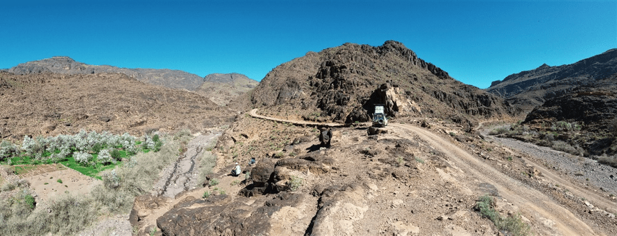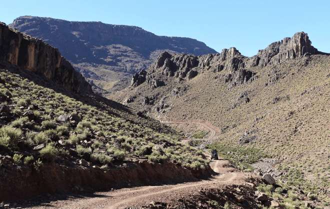 Hier valt het mee met de vliegen en we nuttigen ons uitgestelde ontbijt. De Duitsers komen toeterend weer langs en we zien vanaf ons hoge uitkijkpunt dat ze een andere piste nemen naar het plaatsje Oum-Jrane. We volgen ze met onze verrekijker. Nog twee militaire checkpoint komen we tegen, waarbij de ene snel onze gegevens overneemt en de andere ons direct doorlaat. Wij vervolgen onze route over een aanvankelijk stenige piste, die daarna ter hoogte van het plaatsje Sidi Ali overgaat in zand. In de verte zien we het plaatsje liggen en rijden er ten zuiden langs. De rotsige bergen komen hier bijeen en we komen in een werkelijk schitterende zandvallei die redelijk steil omhoog loopt. De Dinky Toy moet hard werken door het losse zand en Ina geeft flink gas om het momentum te behouden en niet stil te vallen. De 6-cilinder brult! Dankzij de OsMand app weten we precies waar we zijn en daarom zien we kans de overgang over de bergketen te vinden. Dat was even spannend en het vervolg van de route is eenvoudiger en we ontspannen weer. Goed gereden, Ina!