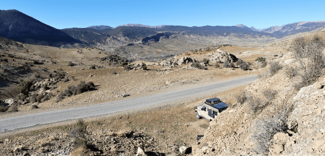 We volgen dus een andere route, parallel aan de bergen. Paul wil zijn slipdifferentieel uitproberen en hij komt erachter dat deze helaas niet werkt. De auto zit vast, maar met onze lier trekken we hem er zo weer uit. Nu we de lier gebruiken, blijkt dat er vonken ontstaan zodra er stroom op de lier komt. Daar moeten we maar een keer naar laten kijken.