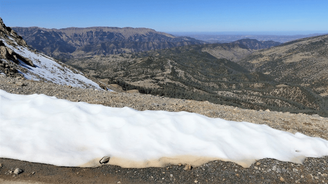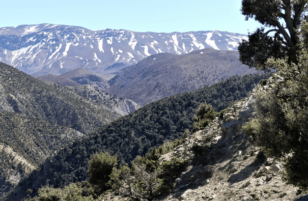 De tocht gaat verder over de Haut-Atlas en na een col dalen we langzaam af richting Boutferda. Er komen meer naaldbomen en dat geeft weer een ander contrast met de besneeuwde toppen. Dagenlang hebben we geen bomen gezien.