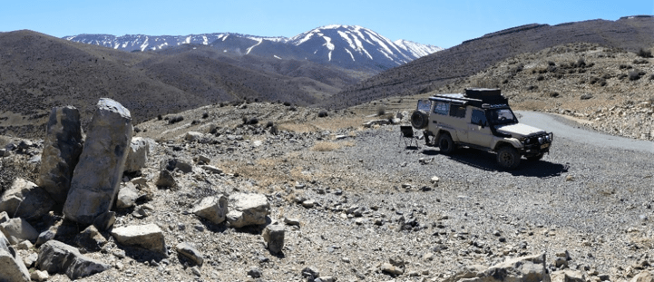 ’s Nachts hebben we prima geslapen. Zelfs de moskee hebben we niet gehoord. Tevergeefs wachten we op ons ontbijt. Misschien hebben we elkaar toch verkeerd begrepen en we smeren daarom zelf een broodje. Ina bedenkt dat we via hotspot ons laatste filmpje kunnen uploaden, want we hebben hier een goed signaal. Jeroen pakt zijn computer en het lukt inderdaad het vierde filmpje op onze website te posten. We vervolgen onze reis naar de pas Tizi-bou-Zabel op 2400 m hoogte. We rijden door de restanten van wat sneeuwvelden en genieten van de schitterende bergwereld. De koffiestop doen we op een magistrale plek. Er staat een gure wind, maar achter de auto zitten we beschut in het zonnetje. De weg is in goede staat en voert ons door de cederbossen. Tussen de bomen door zien we de besneeuwde bergketen en regelmatig stoppen we om het panorama goed in ons op te nemen.