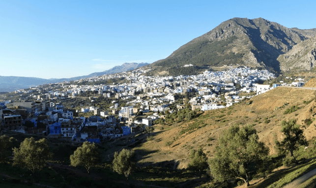 Nadat we de bierflesjes hebben opgeruimd, vertrekken we naar het Rifgebergte. Over de provinciale wegen rijden we naar Chefchaouen, de blauwe stad. Er wordt flink aan de weg gewerkt. Deze wordt verbreed, maar is nu nog een flinke stoffige bouwplaats. Er is veel vrachtverkeer en sommige vrachtwagens zijn zo zwaar beladen, dat ze voortkruipen. Inhalen is met al die wegwerkzaamheden lastig en ook zien we veel politie langs de weg. Opletten dus, want we willen het houden op één bekeuring. De bergen van het Rif zijn duidelijk anders dan de drie bergketens van de Atlas (de Haut-Atlas, de Anti-Atlas en de Moyen-Atlas). Dit maakt het landschap van Marokko ook zo gevarieerd. Ook kenmerkend voor dit gebied zijn de handbewegingen van mannen langs de weg die erop duiden dat ze hasj verkopen. We worden er flauw van.