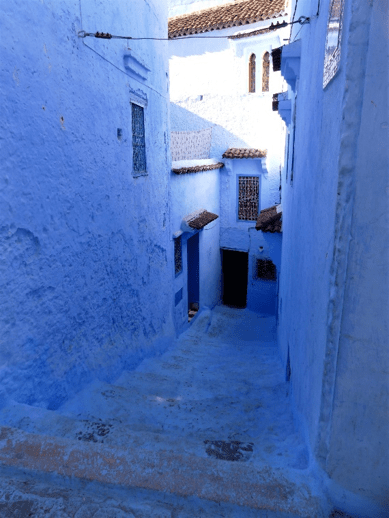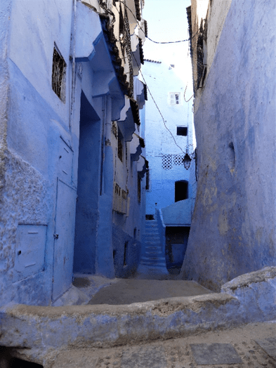 Het is nog rustig, want pas na 10 uur ’s morgens komt heel Marokko tot leven. Hierdoor kunnen we foto’s maken zonder mensen erop. Op een muurtje eten we onze pannenkoeken met honing en een gesuikerde beignet als ontbijt. We dwalen een paar uur door de steegjes en komen uiteindelijk bij het fort en het grote plein uit. Van al dat gedwaal door de nauwe steegjes en fraai gekleurde huizen krijgen we dorst. Hoogste tijd voor een nos-nos die we nuttigen op het balkon met uitzicht op het plein.