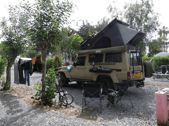 Tegen de avond rijden we de enige camping van Chefchaouen op en we vallen met de neus in de boter. Er is een grote groep met Italiaanse campers aangekomen op de toch al volle camping. De campers staan hutje mutje in twee lange rijen op het gravel. We tellen er al gauw zo’n 60 stuks. Op het steile gedeelte van de camping zijn kleine terrassen gemaakt en daar staan de 4×4 reizigers onder de bomen. “Soort zoekt soort.” zegt Jeroen. Voor al deze reizigers is er één warme douche en de sleutel daarvoor moet bij de receptie worden opgehaald. Uiteraard is er ook maar één sleutel en die circuleert onder de Italianen.