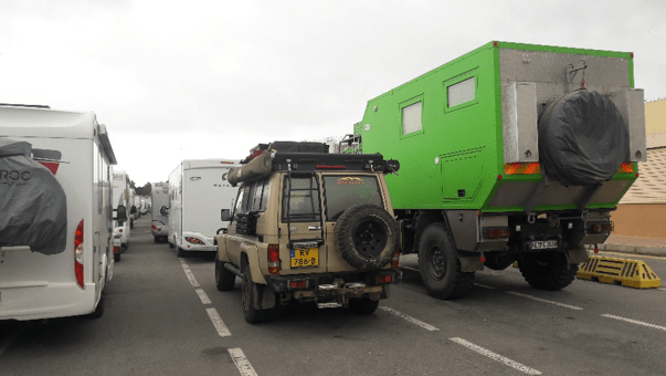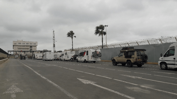 Vandaag is het zondag, dus druk zal het niet zijn. De boot vertrekt met een heleboel niet geboekte stoelen. De oversteek langs de rots van Gibraltar naar Ceuta verloopt snel. Echter het passeren van de Spaans-Marokkaanse grens is werkelijk hopeloos. We gooien de tank vol met diesel en Jeroen vraagt de pompbediende de weg naar de grens. In een mix van Spaans en Arabisch hoort en begrijpt hij de uitleg. Het zal ongeveer een uur duren om de grens te passeren met alle douaneformaliteiten. Dat valt mee. Vlak voor de grens rijden we de aangeduide grote parkeerplaats op. Daar aangekomen zien we zes rijen met personenauto’s, campers, busjes en 4×4-terreinwagens, totaal zo’n 120 auto’s.