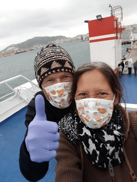 Ceuta is dus een Spaanse enclave op het noordelijkste puntje van Marokko, tegenover Gibraltar dat weer niet Spaans is. Snapt u het nog? Het is klein en binnen 10 minuten kunnen we aansluiten in de rij wachtende witte campers en de drukte valt ons mee. Ina loopt direct naar voren waar de dame in een hokje iedereen incheckt met een geldig ticket. Stilletjes hopen we dat we inmiddels op de inchecklijst staan. Maar na vele pogingen ons in de computer te vinden, blijkt dat dat niet zo is (“Computer says no!”). Ze adviseert ons ‘Direct Ferries’ te bellen, maar daar hebben wij geen nummer van. “We kunnen proberen dat telefoonnummer op te zoeken op internet.” “Hmm, dat wordt vast niets. We zijn zojuist langs de kantoren van de bootmaatschappijen gereden. Als we daar eens gaan kijken?” Daar aangekomen blijkt dat er niemand aanwezig is. Alles is gesloten. “Ik heb ook de terminal gezien voor de passagiers zonder vervoermiddel. Vaak zijn daar ook balies en misschien kunnen we daar aan een ticket komen.” “Oké, ik ga wel, blijf jij maar in de auto.” Ina springt de auto uit en loopt naar binnen. Twee kantoren zijn open en uiteindelijk kunnen we voor twee personen en de auto nog een bootticket kopen voor € 98,00. Gewoon een normale prijs. De boot vertrekt om 13.45 uur! Snel weer terug naar de haven en aansluiten in de rij. En ook de Duitsers met hun 4x4Unimog staan er. We krijgen van hen mondkapjes en handschoenen voor op de boot, zo aardig. Onze broers worden geïnformeerd en zij zijn net zo opgelucht als wij. We zijn benieuwd of we met deze boot mee kunnen, want inmiddels is het parkeerterrein stampvol. We houden er rekening mee dat we wellicht een boot later moeten nemen, deze zou rond 19.00 uur moeten gaan. “Weet je, ik moet aan echte vluchtelingen denken en hoe ze zich moeten voelen.”