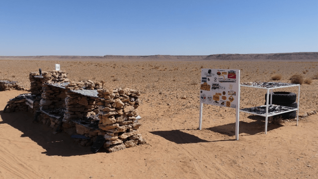 Omdat we relatief dicht bij de grens met Algerije zijn, komen we regelmatig militaire checkpoints tegen. Vaak een klein betonnen gebouwtje in een totaal verlaten woestijn, soms met een slagboom. Ze willen je gegevens graag hebben, waarbij we ons afvragen wat ze er ooit mee gaan doen. Op zich wel een prettig idee dat bij een eventuele calamiteit bekend is waar wij het laatst zijn gesignaleerd. Bij het eerste militaire checkpunt vraagt de dienstdoende militair of we een fiche bij ons hebben met al onze gegevens. Tja, die hebben we wel, maar nog niet ingevuld. Daarop pakt hij zijn mobiel en maakt een foto van onze paspoorten. Snel en modern opgelost! “Hebben jullie iets te roken?” vraagt hij. “Nee, we roken niet en we hebben ook niets bij ons.” “Oh, maar hebben jullie dan een souvenir voor mij?” “Nee sorry, alles wat we bij ons hebben, is nodig om te leven.” Teleurgesteld wenst hij ons nog een goede dag en gebaart dat we door kunnen rijden. We vorderen behoorlijk en zien op een gegeven moment de Duitsers staan met een open motorkap. Uiteraard informeren we of er problemen zijn, maar volgens hun is er niets bijzonders, een rammeltje of zo. Tja, met een Landrover weet je het nooit….