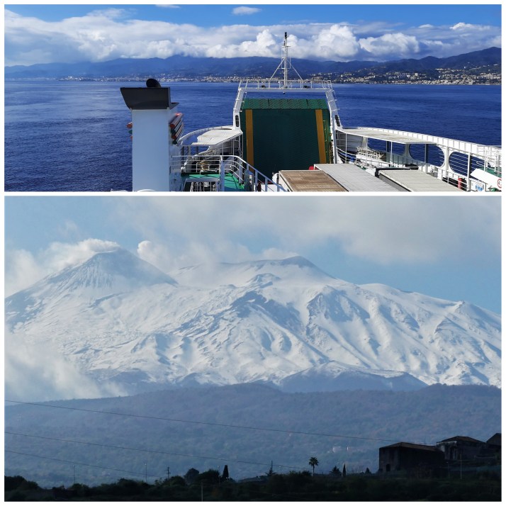 Uiteindelijk vertelt een Carabinieri dat we via de snelweg moeten rijden om bij de ferry te komen en nu is het simpel te vinden. De oversteek gaat in het zonnetje, maar Sicilië ziet er bewolkt uit.