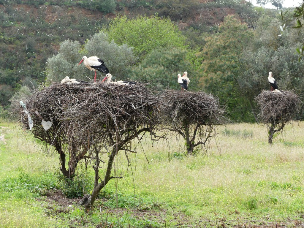 We vervolgen onze weg en het wordt langzamerhand droger. Volgens de kaart is de route bij Monchique mooi en dus rijden we wat om. De heuvels worden hoger en steiler en de wegen kronkelen daarover heen. Inderdaad mooi. Het stadje zelf is niet veel bijzonders. De regio Silves is bekend om de vele ooievaars die daar nestelen en dat zien we duidelijk als we langs een veldje rijden met lage boompjes. Letterlijk op elk boompje is een nest gebouwd! Bizar om te zien.