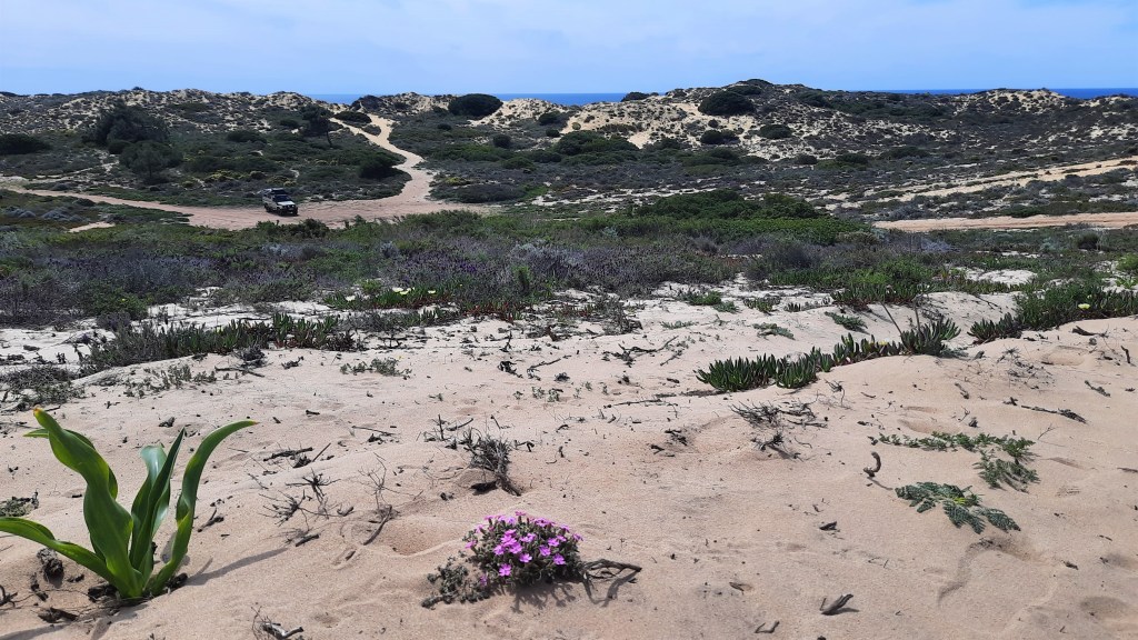 We rijden door en al snel weten we het spoor op te pakken dat over zandpaden naar Porto Covo gaat. Jeroen schakelt de 4×4 aandrijving in en daar gaan we! Links van ons is een hogere duinenrij en rechts van ons een flauw heuvellandschap met duinvegetatie, zoals diverse vetplanten en een soort heide. Er zijn veel sporen, dus is het bij elke splitsing een beetje zoeken welk spoor we moeten hebben. Op een gegeven moment wordt het zand zachter en meer mul. De motor moet harder werken en we komen zelfs tot stilstand als we een hoog duin oprijden. Dus achteruit weer het duin af en we laten lucht uit de banden lopen, tot zo’n 1,5 bar. In lage gearing proberen we het nu nog een keer, maar in een bocht zakken we alsnog diep weg in het zand. Nu kunnen we 2 dingen doen: of nog meer lucht uit de banden laten lopen, of terug en een andere route zoeken. We besluiten tot dat laatste en al snel lukt het ons om een goed spoor te vinden. Met de zachte banden is het heerlijk comfortabel rijden over de zandpaden en we deinen in een rustig gangetje door het duinengebied. Op een vlakke open plek houden we een koffiepauze en we overwegen om hier ons bivak te maken. Echter, dit gebied is aangemerkt als een natuurgebied en het is uitdrukkelijk verboden om hier te overnachten. Niemand zal ons midden in de duinen betrappen, maar we begrijpen de bedoeling van de Portugese overheid en dus houden we ons aan het verbod. Het is al mooi dat we hier doorheen mogen rijden.