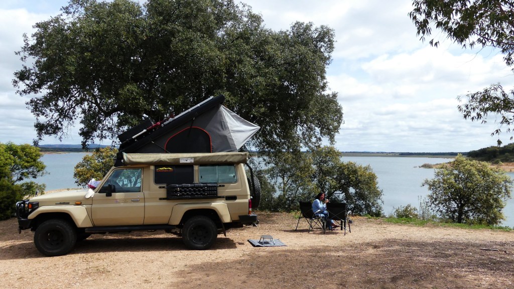 Met moeite laten we deze prachtige kust achter ons en vervolgen onze weg naar het stuwmeer Albufeira de Barragem de Ovidelas. Aan dit stuwmeer ligt de mooie, maar relatief wat dure camping Markádia. Het is gelegen op 10 hectaren natuurgebied en je mag staan waar je wilt, als het maar op tenminste 10 meter is van je buren. Kijk, dat vinden we nou nog eens een goede kampregel. We vinden een plek op het uiterste puntje onder een steeneik en hebben 270 graden uitzicht op het meer. Onze buren staan minstens 50 meter verderop, omdat op onze plek geen elektriciteit is. Komt ons dat even goed uit. Soms schijnt de zon, af en toe waait het hard, maar we hebben een paar heerlijk relaxte dagen.
