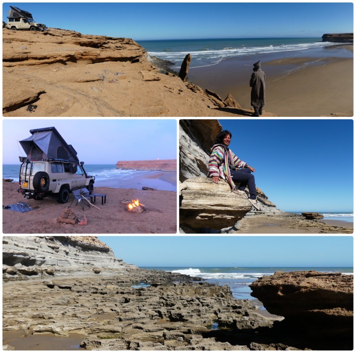 We reizen verder naar ten zuiden van Tan Tan en komen uit boven op een klif met uitzicht op oued Oum Fatma en de zee. Bij helder weer zien we de Canarische eilanden. Weer een fantastische plek gevonden. De sterrenhemel ziet er zo zuidelijk enigszins anders uit: de Grote Beer staat heel laag en de sikkelvormige maan ligt nu lui op z’n rug, als een hangmatje. In de nacht schijnen militairen voortdurend met zeer sterke zaklantaarns de omgeving af, op zoek naar bootvluchtelingen en drugskoeriers. De volgende dag klauteren we het klif af naar beneden, lopen op het strand en sprokkelen drijfhout voor een kampvuurtje. De rotsige kust is zeer fotogeniek. De zee heeft allerlei vormen in de rotsen geslepen en we blijven fotograferen. Na een paar uur klimmen we weer omhoog naar de Toy met de zware stapel drijfhout en komt Housin Ouasim voorbij op z’n brommer en stopt voor een praatje: “Bonjour! Ca va?”. Hij is visser, we schatten hem midden twintig en we hebben hem gisteren al ontmoet. Hij heeft nog één vis over die we voor Dh 100 kunnen kopen. We dingen af naar Dh 80. Housin legt ons uitgebreid uit welke verschillende vissen er zijn die op elkaar lijken, maar elk een andere kwaliteit hebben en dus ook een andere prijs hebben. Ter illustratie toont hij foto’s op zijn smartphone en benoemt de details. Hij verkoopt ons de duurste vis…(tuurlijk!)… en verzekert ons dat dit de top van de top is. En inderdaad, dit is de beste verse vis die we ooit hebben geproefd. Het leek wat op een mix van zalm en kabeljauw met een grote grove graat zodat we hem in moten konden bakken. We spreken met hem af om over twee dagen naar Naïla te rijden. Daar is een lagune waar flamingo’s en pelikanen zijn. Ook is het fantastisch viswater. Housin heeft een boot en hengels en wil Jeroen wel een dagje meenemen om te vissen voor 400 Dh. Jeroen ziet dat wel zitten.