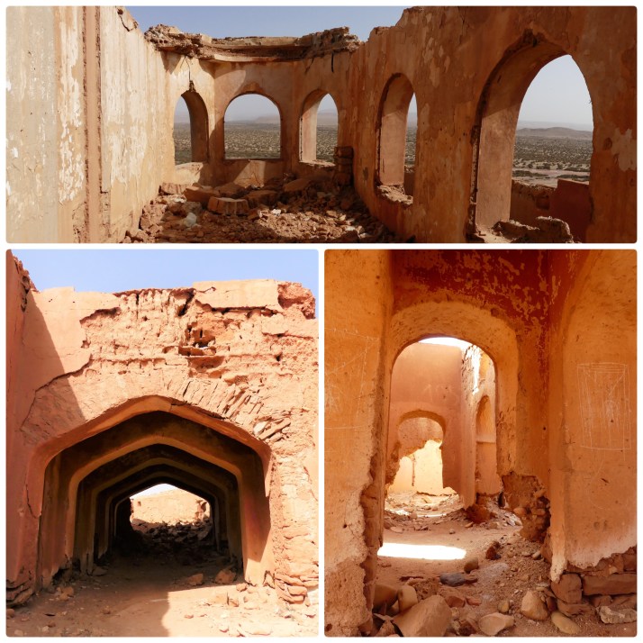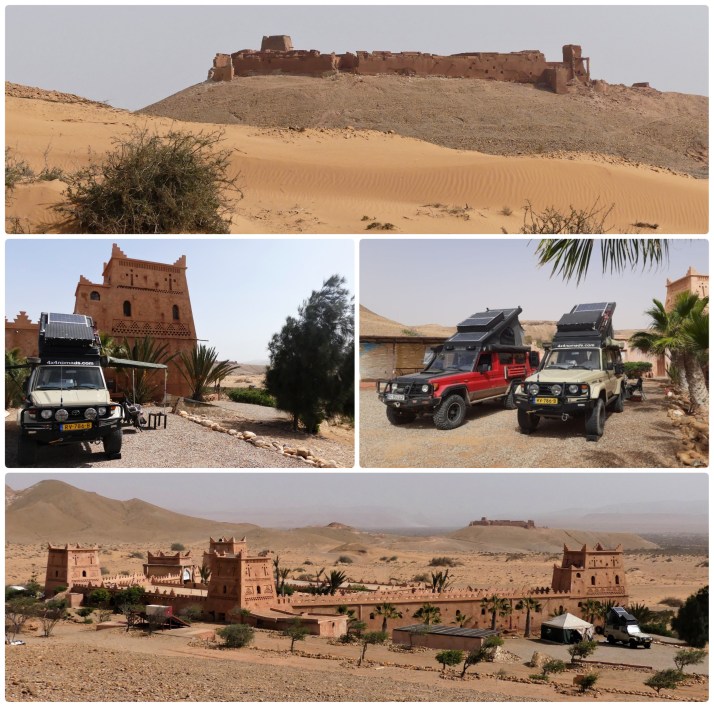 We worden wakker van de vogels en het blijkt dat we best op een mooie plek staan. De temperatuur is aangenaam en we kunnen weer buiten ontbijten. We besluiten om eerst zuidelijker te gaan, omdat de pistes op dit moment te nat zijn. Bij Tan Tan is er minder regen gevallen en we komen terecht bij Ksar Tafnidilt, Caïdat de Tilemzoun. Alleen toegankelijk voor 4x4s. Naast de mooie oude ksar op een heuvel staat een nieuwe ksar, ook op een heuvel. We rijden door de poort het complex binnen. Een hotel met veel kamers, restaurant, een boetiek, een zwembad in de fraaie binnentuin, een mooi ingerichte zaal voor waarschijnlijk feesten en partijen, olijfbomen en dadelpalmen. Alles goed onderhouden door Frans/Marokkaanse eigenaren en een creatief oog voor de vele details. Het is werkelijk een paleisje. We gaan hier een paar dagen uitrusten en genieten van het mooie weer dat komen gaat. We hebben er aardig wat kilometers voor moeten rijden, maar dat hebben we er voor over. We bekijken de oude ksar en vinden zo’n ruïne toch altijd interessant.
