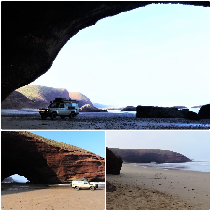 Vanaf deze plek rijden we weer in etappes noordwaarts langs de kust richting Ceuta, om daar de ferry te nemen naar Spanje. Onderweg doen we nog Plage de Legzira aan. Marcio heeft ons foto’s laten zien dat hij met zijn rode Toy over het strand onder de rotsen door heeft gereden. Dat willen wij ook! In het dorpje gaat een zeer smal pad steil naar beneden en er staat een eenrichtingsverkeerbord. We mogen dus niet verder, maar Jeroen doet net of hij het bord niet heeft gezien en wurmt de Toy tussen de huizen door, zo het strand op. We worden nog nagestaard door een restauranthouder die tafeltjes klaar zet op het strand voor de lunch. Meteen zien we verderop de rotsen met de natuurlijke doorgang. Het is werkelijk fascinerend om te zien. Roestrode rotsen die in de blauwe zee verdwijnen en een natuurlijke poort vormen waar je onderdoor kan. Jeroen crost wat heen en weer en Ina maakt daar mooie plaatjes van.