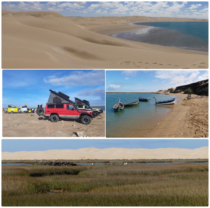 Jeroen en Housin gaan naar de vissers, maar niemand heeft verse sardines. Wel kan Jeroen blinkers kopen, maar volgens Housin trappen de vissen daar niet in. Na veel gedoe hakt Jeroen de knoop door, we gaan niet vissen! Wat een deceptie. Met de vriend van Housin varen we weg, en Housin blijft op de steiger achter. Omdat de boot best ruim is, hebben we onze Zwitserse buurman René aangeboden om mee te gaan. Hij zei meteen ja. René is met zijn 20-jarige dochter op reis met een soort amfibievoertuig. Een 6-wielige quad die een trailer voorttrekt met daarop gedemonteerd een catamaran. Hiermee zijn ze van Spanje naar de Canarische eilanden gevaren, met de quad op de catamaran. Het is niet te geloven dat ze dit hebben gedaan. Ze zijn in een storm terecht gekomen met golven van 6 meter hoog en de dochter was panisch geweest, hetgeen we ons goed kunnen voorstellen. Voor geïnteresseerden hun website: www.switzerlandexpress.ch  Nu gaan ze over land weer terug, op aandringen van zijn vrouw. De lagune is een mooi natuurgebied, met rietvelden omringd door duinen. We zien heel veel verschillende soorten watervogels, zoals flamingo’s, pelikanen, aalscholvers, sterns en allerlei steltlopers die we niet zo één-twee-drie herkennen. Een mooi boottochtje, zonder dat er is gevist! We ontmoeten op deze plek ook weer Marcio in zijn rode Toy. We eten samen en krijgen van hem koffielikeur mee, gestookt door zijn vader. “Neem gerust mee, ik heb thuis nog zo’n 200 liter liggen!”