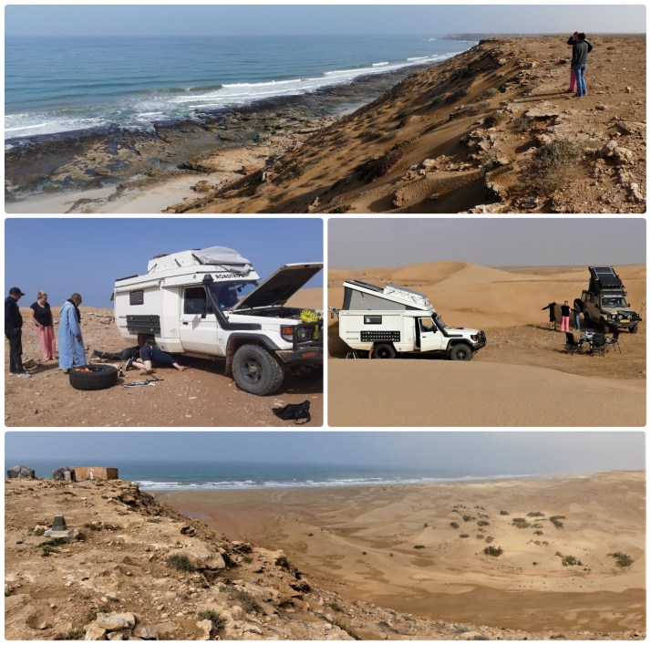 We ontmoeten het jonge Duitse stel Lucas en Anna, ook in een Toy. We spreken af om samen de offroad route naar Plage Blanche te rijden. Hun werk is het maken van reizen en daarover maken ze documentaires die ze verkopen via Youtube. Het is zeer de moeite waard om een kijkje te nemen op hun website: http://www.ruggedroadtrips.com en op youtube: youtube.com/lucasjahn De beelden spreken voor zich! Om 08.15 rijden we weg vanaf de Ksar in verband met laag tij. De route gaat namelijk voor een groot deel over het strand. Het eerste stuk piste is erg slecht door de hevige regenval. De piste is soms totaal verdwenen en scherpe stenen beletten ons om een beetje door te rijden. Hierdoor missen we het laag tij en we besluiten om in de duinen een bivak te maken. Anna rijdt voorop, daalt een duintje af en raakt met de zijkant van de achterband een scherpe rots. Luid sissend loopt de band in 30 seconden totaal leeg! Het reservewiel ligt in de kist op het dak. Het is nog een hele toer om die eruit te krijgen. Jeroen pakt daarvoor uit onze ‘garage’ een spanriem. Met zijn tweeën takelen Jeroen en Lucas het wiel uit de koffer en Anna ‘vangt’ het wiel op. Ina filmt alles, de rollen zijn goed verdeeld….Plots passeren drie mannen uit Agadir in een 4×4. Ze gaan helpen en in een mum van tijd zit het reservewiel eronder. Ina is ondertussen water aan het koken voor de thee, maar de mannen willen doorrijden. Wat een aardige mensen. “Jullie zijn van harte welkom in Marokko”, zeggen ze nog met de hand op het hart. “Shoukran”, zegt Ina meerdere keren. Ook met haar hand op het hart.