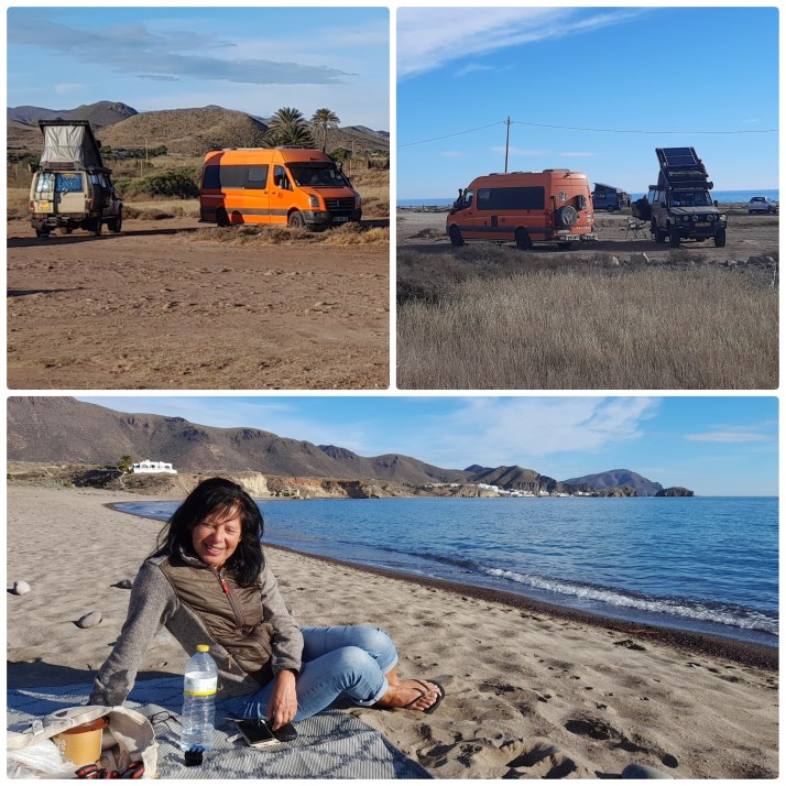 Deze morgen staat al weer het ontbijt voor ons klaar. Eerst nemen we een warme douche. Dat is echt een traktatie. Na het ontbijt nemen we afscheid van elkaar en we hopen elkaar weer gauw te zien, waar dan ook. Vandaag rijden we niet zo lang. We hebben afgesproken met Ron & Trees in Los Escullos. Zij maken een bivak aan het strand met hun oranje bus. Niet te missen met zo’n opvallende kleur. Het weerzien is als vanouds gezellig. We kletsen wat, we drinken samen iets, proosten op een jaar vol avontuurlijke reizen, knuffelen met Rosie 🐾, we maken een wandeling en eten samen. Ook vandaag liggen we voor ons doen vroeg in bed. De volgende ochtend is het aangenaam warm en bijna windstil. Ideale omstandigheden dus voor een ontbijtje aan het strand. We nemen het strandmatje mee, lopen naar het verlaten strand en we genieten volop. Na het ontbijt drinken we een bakje koffie en klappen de daktent in en vervolgen onze reis. On the road again!