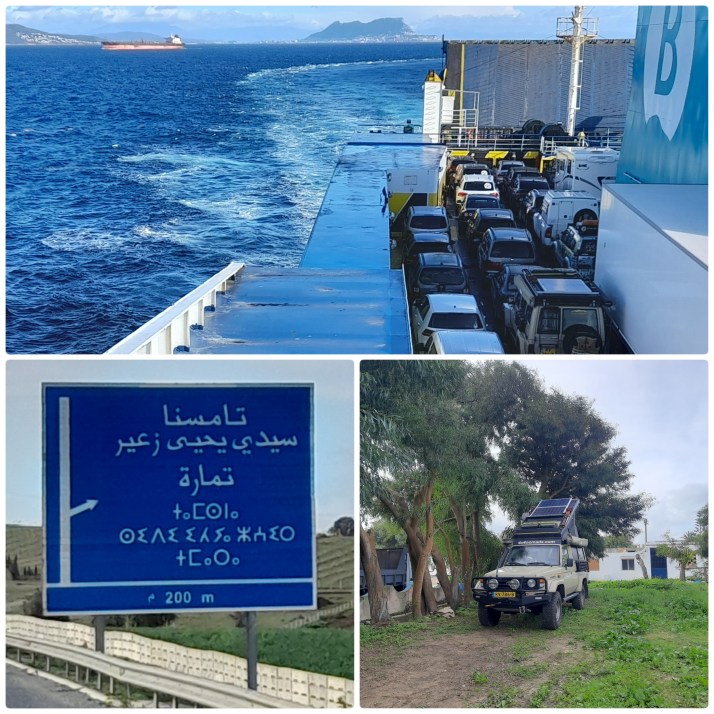We arriveren na een snelle overtocht in Tanger Med, de nieuw aangelegde haven. Op de boot zijn we al door de paspoortcontrole gegaan. We rijden van de boot af en over goed bewegwijzerde kades. Eerst gaat Jeroen naar het douanekantoor om de auto tijdelijk in te voeren, maar krijgt van een snotneus van een agentje met een veel te grote pet te horen dat toeristen in de auto moeten blijven! Zijn oudere collega komt breed glimlachend naar ons toe en vraagt vriendelijk paspoort en kentekenbewijs. Deze neemt hij mee en wij moeten wachten. We vermaken ons met kijken naar de speelse drugshonden die ook even in onze Toy mogen snuffelen. Eindelijk komt de douanier terug met het bewuste kaartje voor de tijdelijke invoer van de auto. Goed bewaren! Tegenwoordig gaat dit dus veel gemakkelijker dan 17 jaar geleden. Geen gedoe meer met corruptie, onterecht geld betalen, lange wachttijden, zogenaamde helpers die geld vragen voor hun aangeboden hulp, geen verkopers die je ongevraagd muntthee aanbieden (lees: aansmeren). Kortom, goed geregeld. Aan de overkant zien we Spanje liggen. Wij rijden verder zuidwaarts langs de hoge hekken die de vluchtelingen moeten tegenhouden. Op naar Assilah, naar de camping Echrigui. We zijn in Assilah. We kennen de weg en we besluiten om eerst een nos-nos te drinken en een SIMkaart tvan 10 Gigabite te kopen. De parkeerwachter Adil biedt hulp. We hebben al een SIMkaart van Maroc Télécom en deze hoeft alleen te worden opgeladen. Echter, daarvoor moet de kaart eerst worden ontgrendeld. Dus loopt Ina met hem naar het kantoor. Die is gesloten. De beveiliger zegt dat het beter is om een SIMkaart van Orange te  kopen, want die hoef je nooit te ontgrendelen en is altijd geldig. Daar gaan we voor. Deze SIMkaart kost Dh 60. De opwaardeerkaart van Maroc Télécom moet worden geruild voor Orange. “Geen probleem”, verzekert Adil, “die kun je kostenloos omruilen.” Maar de eigenaar van het stalletje heeft pauze en we staan voor een dichte rolluik. Ina neemt Adil mee voor een nos-nos. We wachten lang. Jeroen rijdt alvast naar de camping. Na een uur wachten zegt Ina dat ze een opwaardeerkaart van 1G bij de buurvrouw koopt en morgenochtend terugkomt om de eerste opwaardeerkaart te ruilen. Ina wandelt naar de camping. Wat staat het er vol! Hier is het altijd een komen en gaan van campers voor een overnachting die van en naar de ferry rijden. Even zoeken waar de Dinky Toy staat. Ja hoor, gevonden. Niet op een officiële plaats, wel ergens achteraf tegen de muur. Het is maar voor 1 nacht.