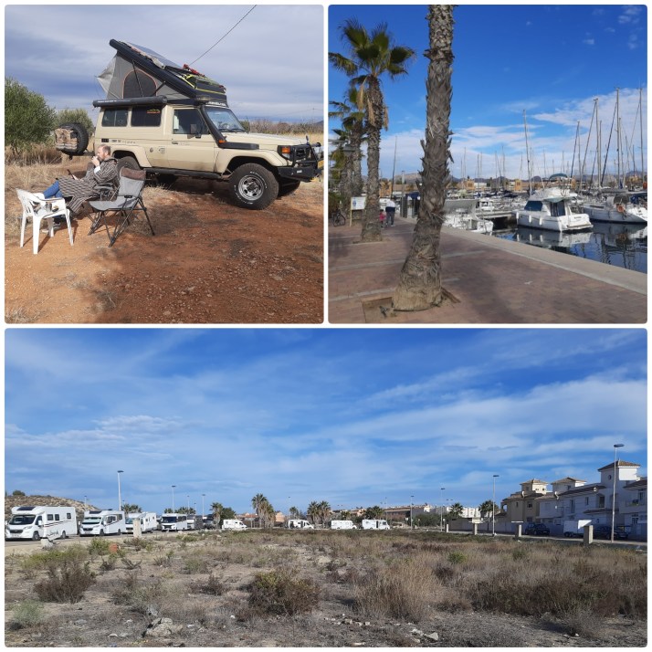 We nemen afscheid van Hester. In de auto eten we oliebollen en appelflappen als ontbijt. Wat een traktatie! Vandaag is de eindbestemming Puerto de Mazarrón. Toevallig zijn Indira en Gerard (familie) daar. Altijd gezellig om hen weer te zien. Voor hun huis staan vaak veel grote, witte campers en ziet het er letterlijk wit voor hun ogen. Wij parkeren er tussen en met onze Dinky Toy vallen we behoorlijk uit de toon (lees: wat een fantastische, unieke 4×4). ’s Avonds eten we bij hen. Gerard heeft nasi goreng gemaakt. Lekker hoor! We kletsen wat af en we proosten er op los. Gezelligheid kent geen tijd, maar het buitenleven maakt je rozig en we duiken niet te laat onze daktent in.