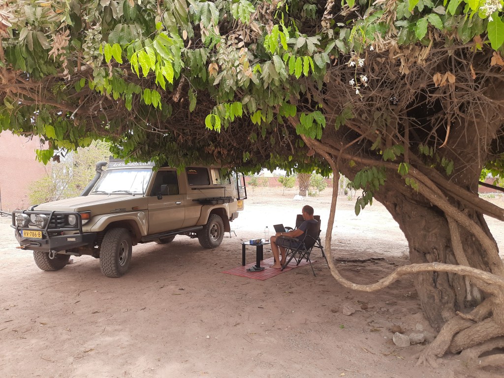 Uitslapen gaat niet lukken doordat het al gauw te warm wordt in de daktent en door al het verkeer dat voorbij rijdt. Jeroen koopt een stokbrood bij de bakker en we ontbijten naast de auto, ondertussen alle voorbijgaande wandelaars begroetend. Op tijd wakker worden heeft als voordeel dat we gemakkelijker aan de warmte kunnen wennen. Voor ons doen vertrekken we vroeg naar Vélingara. Zo komen we al dichter in de buurt van het Niokolo-Koba Park National. Onderweg zien we meer en meer dorpen met traditionele huizen. Het lijkt wel op verschillende campementjes. Een aantal ronde hutjes en ronde schuren met rieten daken staan bij elkaar binnen een omheining van stokken en gevlochten matten. De binnenplaatsjes zien er verzorgd uit. In Vélingara kamperen we bij Hotel Lew Lewal. We staan naast een grote boom met witte bloemen en vruchten die wat zurig smaken. De vruchten zijn helaas niet meer goed. In de dichtbegroeide kruin schuilt voortdurend een grote groep mussen die luid kwetteren. Snel zetten we de stoelen in de schaduw van de boom. De beste plek bij 42°C. De eigenaar Demembalo begroet ons vrolijk. We bewegen ons zo min mogelijk. ’s Avonds koelt het maar mondjesmaat af. Pffff!
