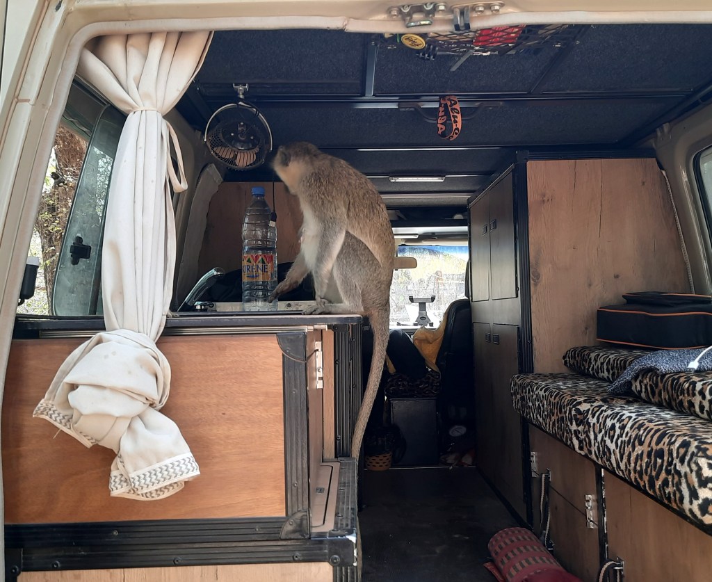 Eindelijk bereiken we ‘Campement Du Lion’. Hier staan eenvoudige ronde hutjes om in te overnachten, wij slapen in onze daktent. Er is een toilet en douchen kan door te mandiën (water over je heen gieten met een bakje). Eenvoudig, doeltreffend en wij vinden het prima. We staan vlak bij de rivier de Gambia. “Het is zo heet”, zegt Jeroen, “ik neem een duik in de rivier.” “Non Non!!”, roept Lasana verschrikt. “Dat is verboden. Er zijn hier krokodillen.” Lasana spreekt met ons af om om 17.00 door een deel van het park te rijden. Dat is de tijd dat de dieren na hun siësta wakker worden en op zoek gaan naar eten en drinken. Terwijl we in de schaduw zitten, zegt Jeroen dat we visite hebben. Ina draait zich om en ziet een ‘singe vert’ de auto in gaan, een grijsbruin aapje. Hij is niet bang, vist een banenschil uit de prullenbak en loopt er rustig mee uit de auto. Hij laat zich niet afleiden door Ina die hem filmt. Als hij het lekkere deel aan de binnenkant van de schil op heeft, gooit hij de schil van zich af en voegt zich bij de groep apen.