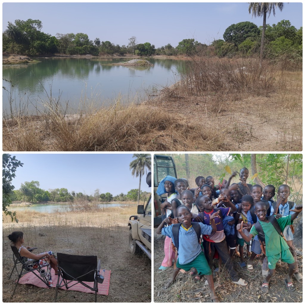 De prachtige natuur van de Casamance gaan we verlaten. Pape, de eigenaar van ‘Campement Casamance’ vindt dat we moeten blijven. Omar zegt tegen zijn collega als grap dat hij de poort direct moet sluiten zodat we niet weg kunnen. Als het zwembad af is, zal hij ons een foto sturen en hoopt hij dat we terug komen, inshallah. We wensen Pape veel succes met de verdere verbouwing van het Campement. We rijden het pad op naar de hoofdweg, de N6 en slaan linksaf. Vanaf hier is het 430 km naar Tambacounda in het oosten waar we naar toe gaan en van daaruit naar het ‘Niokolo-Koba Nationaal Park’. Nee, dat doen we niet in één dag. Ten eerste lijkt ons de weg er naar toe te mooi om er met een noodgang doorheen te rijden. Ten tweede wordt het ’s middags te warm in de auto. We hebben geen airco en met de ramen open rijden, helpt slechts een klein deel tegen de hitte. De N6 is een goede asfaltweg zonder gaten en het deel tussen Ziguinchor en Tanaff is gefinancierd met geld van de Amerikaanse bevolking. We passeren ontzettend veel dorpen met vele hoge drempels, waardoor het gemiddelde rijtempo maximaal 50 km/u is. Onderweg worden we één keer aangehouden door de gendarmerie. De man informeert ons dat hij van alle buitenlanders gegevens in een schrift noteert: het kenteken, rijbewijs, passavant, waar we vandaan komen en waar we naar toe gaan. Wij vinden het best. Ina zit achter het stuur. Volgens de man moet Jeroen rijden, want het passavant staat op zijn naam. “Onzin”, zeggen we tegen elkaar. Na een onderhoudend praatje rijden we door zonder te wisselen van plaats. De weg gaat behalve langs dorpen ook langs mangroven, rijstvelden, groentetuinen en langs een brandje. Af en toe zien we de rivier ‘De Casamance’ en we verbazen ons dat deze nog steeds zeer breed is. Na drie uur rijden wordt het tijd voor een bivak. We willen graag aan een zijarm van de rivier ‘De Casamance’ staan in de hoop op koelte van het water, maar dit is onmogelijk door de drooggevallen mangroven waar je echt niet doorheen kunt rijden. We zoeken verder, nemen een piste, komen langs een dorp en dan zien we een vennetje. Een perfecte plek. We staan iets van de piste af, aan het water, in de schaduw, in een koele bries met uitzicht op de vele vogels, ezels, geiten, koeien en wat huizen aan de overkant van het water. De herder komt langs met zijn koeien. “Kasumai?”, vragen we hem als hij ons groet. “Kasumai baré”, antwoordt hij al zwaaiend. We feliciteren elkaar met het mooie bivakplekje dat we bij toeval vinden.