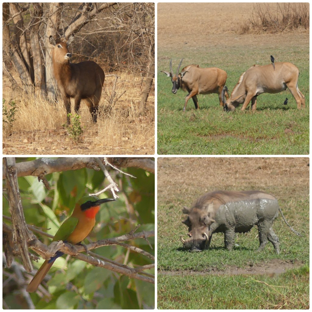 Bij de rivier de Gambia is een overgang gemaakt waar auto’s de overkant kunnen bereiken, de Gué de Damantan. De brug bestaat voornamelijk uit stammen van palmbomen en uit lavastenen die van elders naar het park zijn getransporteerd. De draagkracht van het geheel is op z’n zachts gezegd twijfelachtig. We zien op een paal het waterpeilniveau dat kan worden bereikt. In de regentijd kan het water gemakkelijk 5 tot 10 meter stijgen. Het is bijna niet voor te stellen dat het water in de brede rivier van oever tot oever zo hoog zal komen. In de buurt van de lodge zijn verschillende waterplassen (mare) die we bekijken: Mare Dalafourounte, Mare Woeni en Mare Kountadala. In de regentijd staan ze vol met water. Bij Mare Kountadala is het een komen en gaan van allerlei soorten dieren die we goed kunnen spotten vanuit de door het park aangelegde spotplekken. Met onze verrekijker kunnen we ook de dieren zien die ver bij ons vandaan zijn. We zien zelfs weer een groep bavianen in de verte. Alle dieren grazen en drinken op een vredige manier naast elkaar. En wat daarbij opvalt: soort zoekt soort. Tegen 4 uur ’s middags rijden we het park uit via dezelfde hobbelige piste. We zijn niet lang in het park gebleven, maar we hebben veel dieren en vogels gezien en een goede indruk gekregen van het prachtige park. Onderweg krijgen we nog een toegift van vele dieren die zich laten zien, waaronder de familie wrattenzwijn, een grote groep bavianen en verschillende antilopensoorten. Net voor sluitingstijd bereiken we de uitgang. We nemen afscheid van Lasana en bedanken hem hartelijk voor het gidsen en zijn uitleg over alle diersoorten.