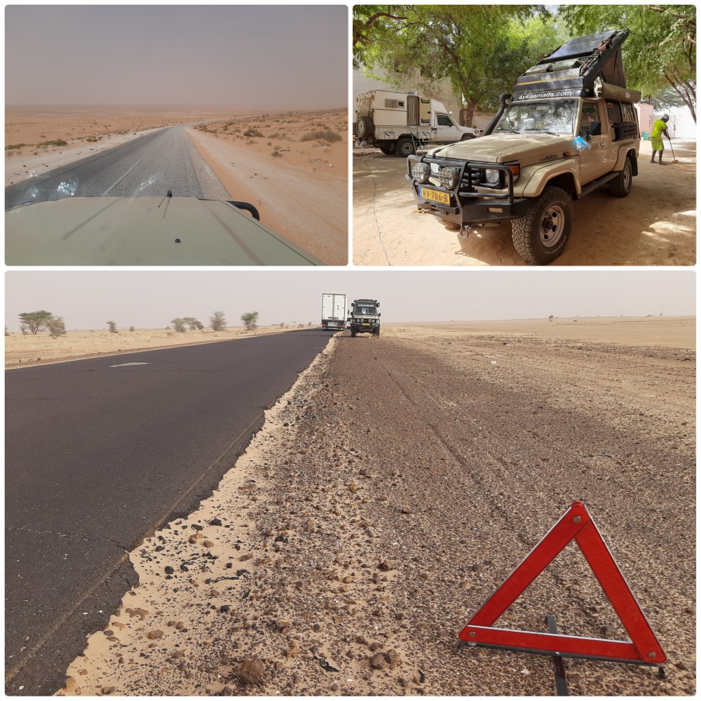 Het plan is om in enkele dagen over de piste van de oude Dakarroute naar Nouadhibou te rijden. Als we de weg oprijden, zien we de grauwe lucht en het waait enorm. Het scherpe Saharazand snijdt in onze gezichten. We zien af van het plan en we rijden rechtstreeks naar Nouadhibou. Het is bijzonder om in korte tijd het landschap te zien veranderen en daarmee de temperatuurverschillen te voelen: van het tropisch savanneklimaat in het zuidelijk deel van Senegal naar het steppeklimaat in centraal Senegal, dat vervolgens overgaat naar een warm woestijnklimaat in het noorden van Senegal. Het zuidoosten van Mauritanië valt binnen de Sahel en de noordelijke helft van Mauritanië ligt in de Sahara. Wij voelen tijdens het eerste deel van de rit vooral de droge warmte met hoge temperaturen. We vervolgen onze weg en ondergaan lijdzaam de hoge temperaturen. Plotseling knipperen af en toe tegelijk vijf waarschuwingslampjes op het dasboard: Tbelt, oliepeil, handrem, brandstoffilter en accu. Dat is een rare combinatie en we vragen ons af wat er aan de hand kan zijn, temeer omdat we tijdens het rijden niets aan de Toy merken. We stoppen en Jeroen vult olie bij in het reservoir. Terwijl hij dat doet, komt een Marokkaan aangelopen. Zijn auto staat verderop met een lekke band. Jeroen heeft er het juiste gereedschap voor en biedt hulp. Ina zet intussen een gevarendriehoek neer. Alle wielmoeren komen los, maar één moer spoelt door en daardoor kan de autoband er niet af. De chauffeur bedankt ons vriendelijk voor onze hulp en hij rijdt met de lekke band langzaam door, in de hoop dat de moer los komt of dat de bout afbreekt. Wij vervolgen onze weg naar ‘Auberge des Dauphins’ waar we kunnen kamperen. We mandiën met koud water wat even wennen is. ’s Avonds koelt het af naar 22°C en de wind steekt op. Oef!! Wat koud!! Buiten zitten is voor ons vanwege de koude straffe wind niet te doen, dus bivakkeren we prinsheerlijk en gezellig in onze Toy.
