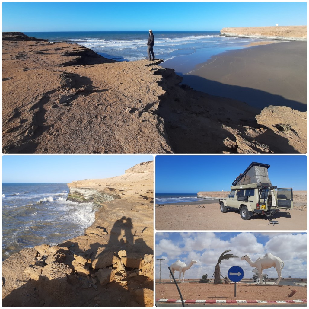 De lange rit van de grens van Marokko door de Westelijke Sahara duurt een eeuwigheid. We kiezen ervoor om er zo snel mogelijk doorheen te rijden. Vandaag wordt het een reis van 4,5 uur. Nog steeds waait het behoorlijk hard en komt de wind recht op ons af. Het zand vliegt in vlagen over de weg. Soms horen we getik tegen de voorruit alsof het regent, maar het is zeer fijn woestijnzand. Ook wervelt het zand omhoog, zodat we regelmatig door een soort mist van zand rijden. Die wind staat hier regelmatig, hetgeen goed is voor de vele windmolens. De reis gaat voorspoedig en we bereiken Oum Fatma waar we vannacht slapen. Vorig jaar stonden we hier een paar dagen. Het is een prachtige plek boven op een klif. Onder ons zien we de lagune. We wandelen naar de klif die uitkijkt op zee. Nogmaals maken we foto’s en een filmpje, omdat we maar niet genoeg krijgen van dit natuurschoon.