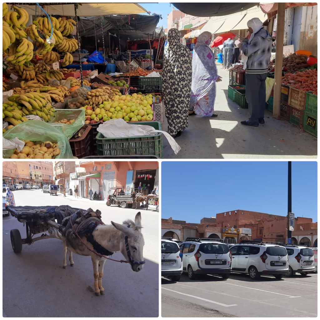 De afgelopen dagen was het voor ons wachten op vandaag om de auto naar de spuiterij van Hassan te brengen. We hebben de auto van binnen schoongemaakt. Dat wil zeggen: het Saharazand zoveel mogelijk verwijderd, omdat we denken dat we niet meer over pistes gaan rijden. De kamer is voor ons comfortabel in vergelijking met de Dinky Toy. Hier houden we het de komende dagen wel uit. We rijden naar Hassan die ons al opwacht. Hij spreekt nauwelijks Frans. Hij weet precies wat hij moet doen, want afgelopen zondag heeft de eigenaar van de auberge de werkzaamheden voor hem vertaald. Hassan snapt ook meteen dat hij de zonnepanelen op het dak moet afplakken. We zullen een taxi terug nemen, maar eerst wandelen we naar de grote rotonde midden in het centrum. We hebben zin in koffie, maar zoals we al zeiden, het is ramadan en alle cafés zijn op dit tijdstip gesloten. Onderweg ziet Ina op straat een koffieautomaat. “Kijk!”, zegt ze tegen Jeroen, “voor 4 dirham kun je hier koffie kopen.” Jeroen bedenkt zich geen twee keer, vist een munt van 5 dirham uit de portemonnee, stopt het muntstuk in het apparaat en kiest zijn koffie uit. Hij hoopt dat de machine wisselgeld geeft en anders is het ook best. Ina heeft niet veel vertrouwen in de koffiemachine. “Wie onderhoudt deze machine in de ramadantijd?”, vraagt ze met enig wantrouwen aan Jeroen. Echter, er is geen weg meer terug en Jeroen wacht smachtend op zijn koffie. “Zie je nou wel!”, roept Ina. De koffie stroomt uit het slangetje, maar er zit geen bekertje onder. Jeroen is zeer teleurgesteld, behalve dan dat hij wel 1 dirham, 10 cent heeft teruggekregen. We zoeken een hotel op in de hoop dat ze voor buitenlandse gasten in de lobby wel koffie serveren, maar dit levert geen resultaat op. Dan maar naar de bakker die 24 uur per dag open is, iets lekkers kopen en bij de auberge eten als troost met een eigen gemaakt bakje koffie. We verheugen ons er nu al op. We houden een kleine rode taxi aan, maar hij verwijst ons naar de grote taxistandplaats. Rode taxi’s rijden alleen in de stad Guelmim. “Dat hadden we kunnen weten”, zegt Jeroen die zich herinnert hoe het openbaar vervoer in Marokko werkt. Buiten de steden rijden de zogenaamde ‘taxis longue’, voor streekvervoer. Als we langs de markt lopen, kopen we nog wat fruit en groente. We vinden het altijd een genot om over de markt te slenteren. Er valt van alles te zien. En zo ook op straat. In korte tijd zijn er in het staatbeeld dingen veranderd, maar ook gelijk gebleven.