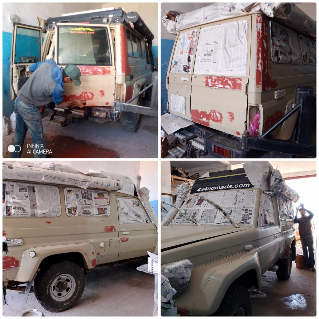 Na deze zomer gaan we onze Dinky Toy verkopen en verruilen voor een Toyota pick-up met een cabine erop. We zijn dol op onze betrouwbare Dinky Toy, maar een Toyota met cabine geeft ons nèt iets meer voordelen en comfort: iets meer ruimte, beter bestand tegen lage temperaturen, een douche in de auto en daardoor kunnen we in de toekomst reizen maken naar koudere oorden. De Toy is prima in orde en Jeroen wil hem nog laten overspuiten, zodat de nieuwe kopers eigenaren worden van een tiptop Toyota. Door al het gereis is er schade door steenslag ontstaan op de lak en is de Toy aan een spuitbeurt toe. De eigenaar van de camping heeft een vriend die spuiter is en vakkundig werk aflevert. Hij belt naar hem die zegt dat we morgenochtend langs kunnen komen. Op zondag? Ja hoor, geen probleem. We rijden met de eigenaar naar zijn vriend om te informeren of hij de auto kan spuiten, hoe lang het gaat duren en wat het gaat kosten. Al gauw doet Jeroen zaken met hem. Hij gaat alle roestplekken behandelen, deukjes wegwerken, de hele auto spuiten in de originele kleur en ook de achterbumper en reservetank zwart spuiten. En dat in 5 werkdagen voor € 600,-. Woensdag kan hij beginnen en zondag is het klaar, inshallah. De komende 3 nachten slapen we in onze Toy en daarna nemen we een kamer bij de camping/auberge. Goed geregeld!