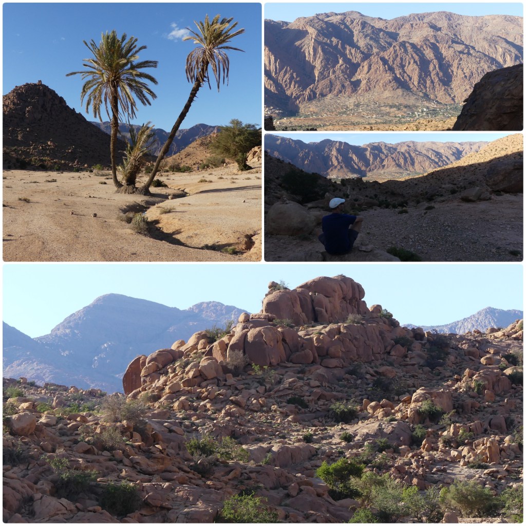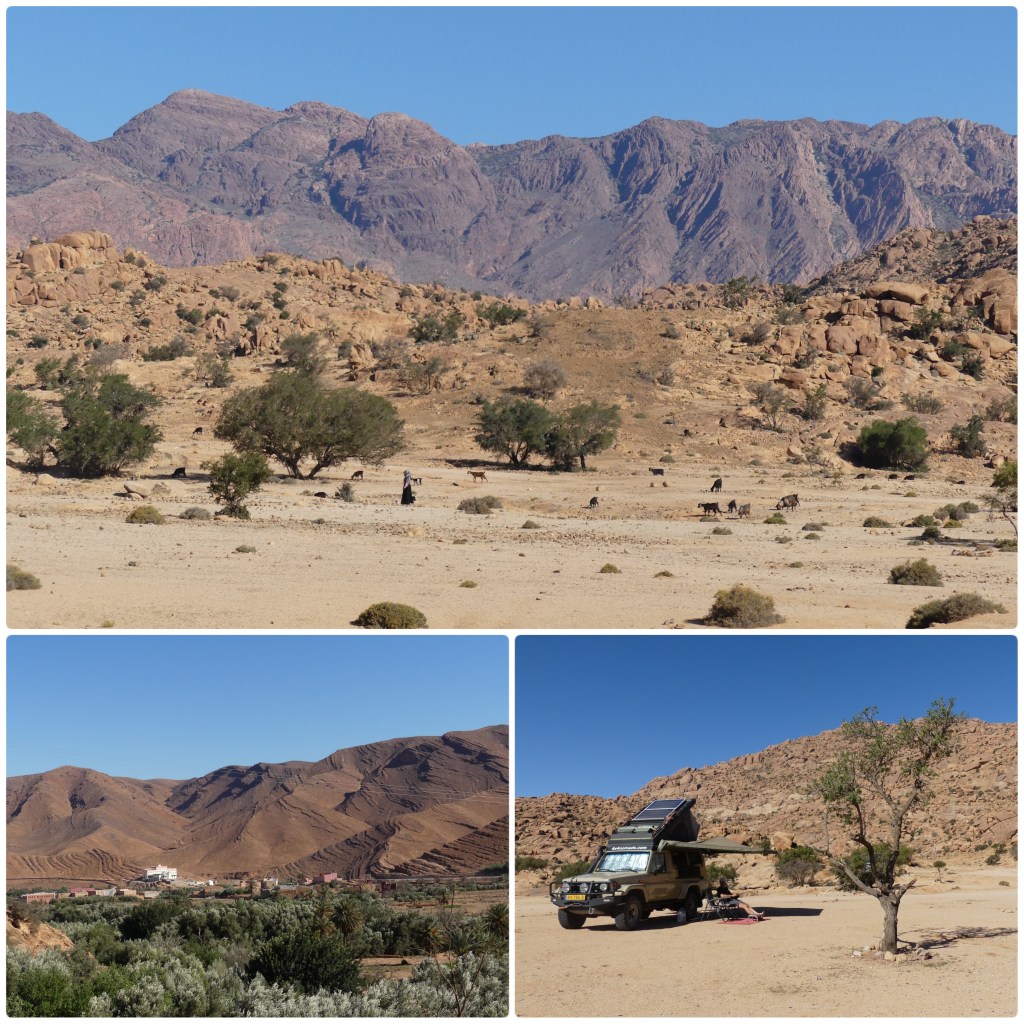 8.00 uur. Oef!! De zonnestralen bereiken al hoge temperaturen en het is te warm om in bed te blijven. Als we buiten komen, zien we rondom ons de prachtige bergen van Tafraout en wanen we ons op één grote jeu-de-boule-baan. Een harde ondergrond en bijna vlak. Vandaar al die Franse campers. Onze Franse buren staan hier al meer dan een week. We geven ze geen ongelijk. In de ochtend is het terrein één grote marktplaats, maar dan volgens een omgekeerd concept. De verkopers rijden naar de mensen en bieden hun waar aan. Er is een bakker op de fiets, die we overigens nog herkennen van de vorige keer, een vrouw die je was kan doen en tevens tajine maakt en bezorgt, een man die gebraden kip in de aanbieding heeft, iemand die arganolie verkoopt en er is een vrachtwagen die water verkoopt. Voor het lozen van grijs water en chemisch toilet is er een voorziening in de straat voor de stad vlak bij het terrein. De stad is op loopafstand te bereiken, maar voor de boodschappen hoef je dus de deur niet uit. De Franse buren vertellen ons dat de burgemeester de gratis kampeerplaats aan de andere kant van de weg heeft gesloten, omdat het versmeerde door de toeristen. De huidige grote plek, geschikt voor wel 150 campers, is nu gereguleerd en biedt voorzieningen. Wij staan er met zo’n 50 campers, iedereen op een behoorlijke afstand van elkaar en dus met veel privacy. Aan het eind van de middag maken we een wandeling. Onderweg zien we een groep nomaden. Hun tenten bestaan uit tentdoeken en plastic. We lopen door en komen bij een ‘zadel’ en kijken naar een enorme bergwand van roze graniet met toppen van 2000 meter. In de vallei loopt een rivier met één grote groene strook oase met dorpen. Een feest voor het oog!