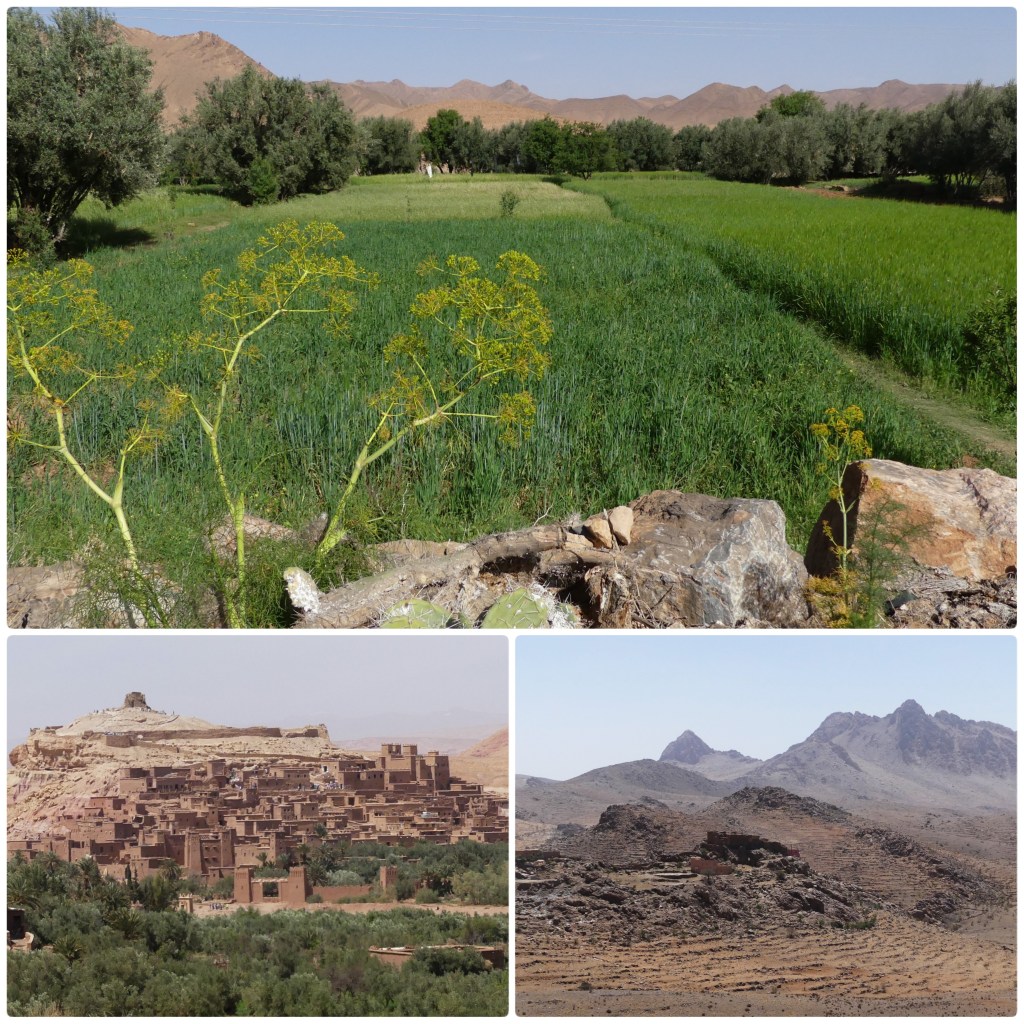 Lang blijven we niet in Taliouine. We hebben nog een lange weg te gaan naar Melilla, de Spaanse enclave in Noord Marokko. Vanuit deze plaats nemen we op 12 april de boot naar Almería in Spanje. Na een ‘vergadering’ van 3 minuten zijn we het er over eens dat we niet de lange route door de bergen nemen. Wel de kortere weg via de bekende ksar ‘Aït Benhaddou’. In 2005 hebben we destijds de piste gereden door de kloof en de dorpen in de oase. Met een 4x4terreinwagen was het te doen, op sommige trajecten ook wel uitdagend. Nu is de piste geasfalteerd en dat willen we wel zien. Eerst arriveren we bij de ksar. Vanaf de overkant kijken we op ‘Aït Benhaddou’ en we zien voor het eerst heel veel toeristen. Niet zo vreemd, want de ksar is nog in tact, prachtig om doorheen te lopen, waardoor deze toeristische trekpleister niet mag ontbreken in de vakantiebrochures. De ksar is tevens een uitstekend decor voor westerns of Indiase films. In diverse films herkennen wij altijd direct het decor. Nadat we zijn uitgekeken, stappen we de auto in. De asfaltweg is beter dan de piste destijds, maar nog altijd even smal en we rijden gemiddeld 35 km/u. Het uitzicht doet ons opnieuw verwonderen. Prachtig! We herinneren ons dat voor de plaats Taboughamt een zoutmijn is. Een piste leidt ons de mijn in. De plek vinden we magisch door de zoutkristallen in de rivier en de kleine stenen huisjes bij de zoutveldjes. We worden omringd door bergen. Waar we ook kijken, elke blik op de gekleurde bergen is fotogeniek en het is moeilijk om te stoppen met het schieten van foto’s. Hier maken we een bivak. De herder met zijn geiten en schapen begroet ons en twee lieve honden komen ons gezelschap houden. We horen enkele vogels en voor de rest is het totaal stil. Dat wordt vast een rustig nachtje.