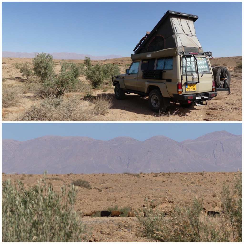 Vlak bij ons staan Dorris en Hans in hun Fiatbus met Pössl inbouw. Zoals zo vaak praten reizigers met elkaar over de reis en het vervoersmiddel. Gisteren hebben we al kennis met hen gemaakt. ‘We’re talking shit’, omdat we vandaag hun composttoilet bekijken, een belangrijke accessoire van de camper. Er zijn voor- en nadelen ten opzichte van een chemisch toilet. Jeroen heeft er al best veel over gelezen op internet. Een composttoilet is biologisch, is gemakkelijker schoon te houden, nummer 1 en 2 zoals de Engelsen het noemen, worden gescheiden opgevangen en nummer 2 hoeft niet vaak te worden geleegd. Een groot nadeel is de hoge prijs. Ondanks de dure aanschaf zijn Dorris en Hans tevreden over hun composttoilet. Hans is geïnteresseerd in onze Toyota HZJ78 en Jeroen nodigt hem uit om over het enorme terrein zelf in onze Toy te rijden, zodat hij voelt dat het totaal anders rijdt dan hun camper. Na de rit zegt Hans dat hij iets heeft om over na te denken. Onze reis van vandaag gaat richting het noorden over de RR106 waarbij we het dorp Igherm passeren. Wederom is het een prachtige rit met een gevarieerd landschap door de Anti-Atlas en we komen amper mensen tegen. Onderweg zien we regelmatig het bord ‘Tata’, maar dat bezoeken we een andere keer weer, inshallah. Even buiten Taliouine, de regio van de saffraan, overnachten we op een camping vlakbij de oude ‘Kasbah El Glaoui’. De motor is nog aan het draaien, of onze buurman staat likkebaardend en goedkeurend onze Toy te observeren. “Dat is toch de beste 4×4”, laat hij ons weten. Zelf rijdt hij in een Toyota Hilux met een kleine cabine. Ook niet slecht. Inmiddels heeft Jeroen de stoelen uitgeklapt en we feliciteren onszelf met een mooie dag en het waanzinnige uitzicht op de bergen. Nooit saai!