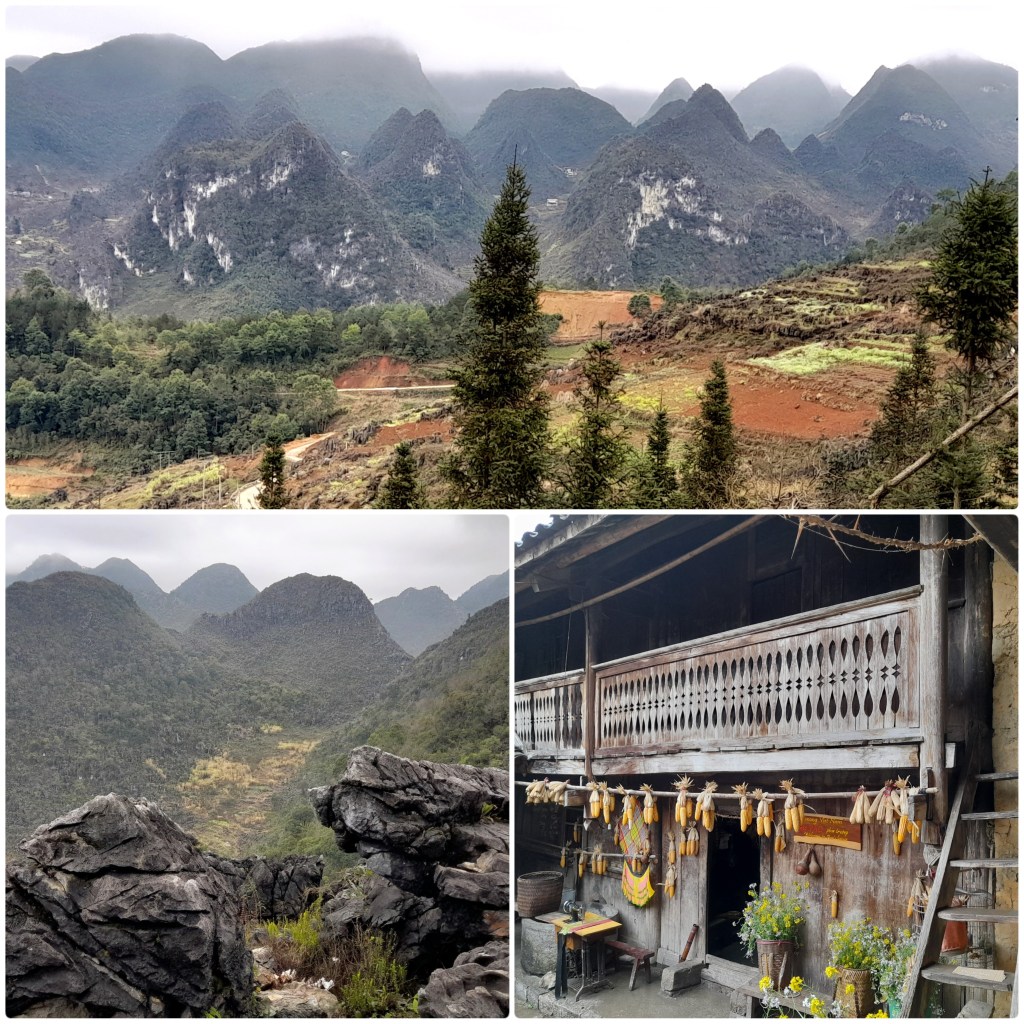 Met de bus zijn we verder naar het Ha Giang district in het noorden van Vietnam gereisd. Een rit van ruim 4 uur. Hier leven veel verschillende bergvolken die hun roots uit China hebben en dat is goed te zien. De bergen bestaan uit kalksteen en dat maakt dat ze mooi zijn geërodeerd. De huizen zijn van hout met veel Chinese kenmerken. De regio heeft niet voldoende water voor rijstbouw. In de valleien wordt op terrassen allerlei groenten geteeld. Het weer was niet best, veel mist en motregen, maar gelukkig trok het af en toe open, zodat we konden genieten van de schitterende omgeving.