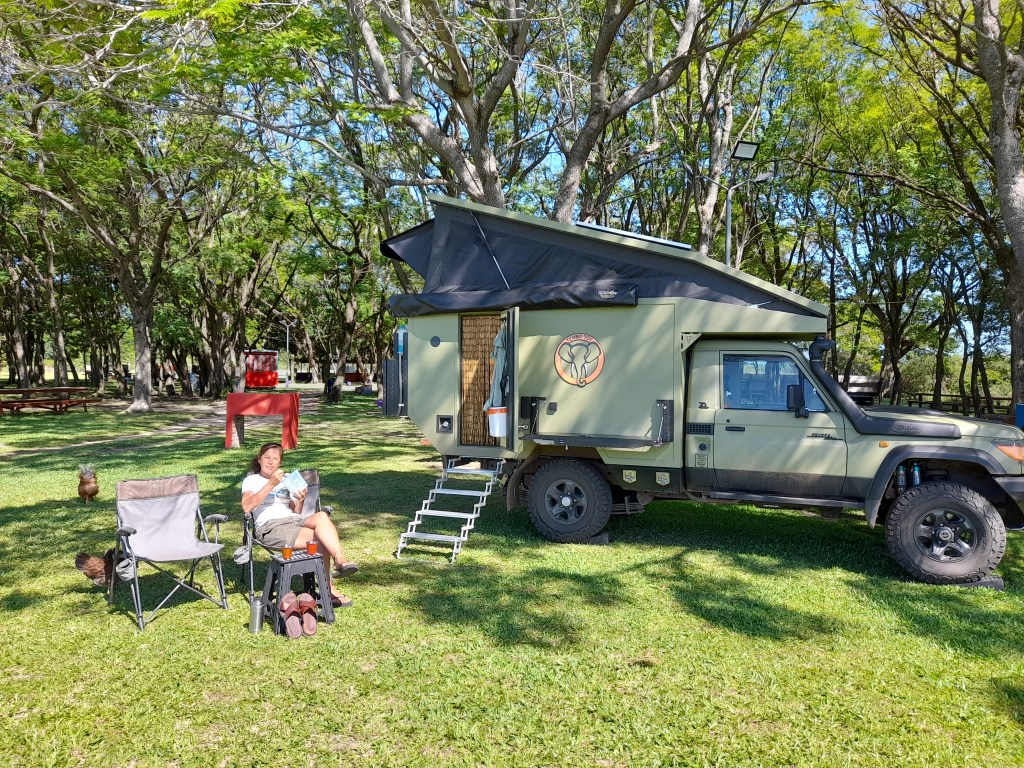 Wat is het plan vandaag? Op tijd opstaan en de grens oversteken van Uruguay naar Argentinië. Het is een korte afstand over het zandpad naar de douane. Qua douaneformaliteiten is het niet te vergelijken met wat we in Afrika hebben meegemaakt. Vriendelijk wordt er gewezen dat we vooral moeten doorrijden, de brug/dam over en dan staan we zo maar voor het loket in Argentinië. De beambte controleert de paspoorten, het kenteken van de auto en geeft Jeroen het Argentijnse formulier van de ‘TIP’, Temporary Import Permit, het bewijs dat de auto 3 maanden in Argentinië mag blijven. Binnen een uur is alles geregeld en we rijden Argentinië in. “Bienvénidos a la República Argentina”. Een autoverzekering afsluiten is niet nodig. In Nederland heeft Jeroen dit al online geregeld voor de Mercosur-landen: Uruguay, Brazilië, Argentinië, Paraguay, plus voor Chili en Bolivia. Eerst gaan we geld pinnen, boodschappen doen en dan door naar Bonpland, een klein plaatsje waar we overnachten op de Camping Municipal. Het staat net buiten het dorp. De camping ligt op een groot terrein waar de lokale bevolking komt om te barbecuen en kinderen kunnen spelen. Er lopen kippen, een haan en parelhoenders vrij rond.