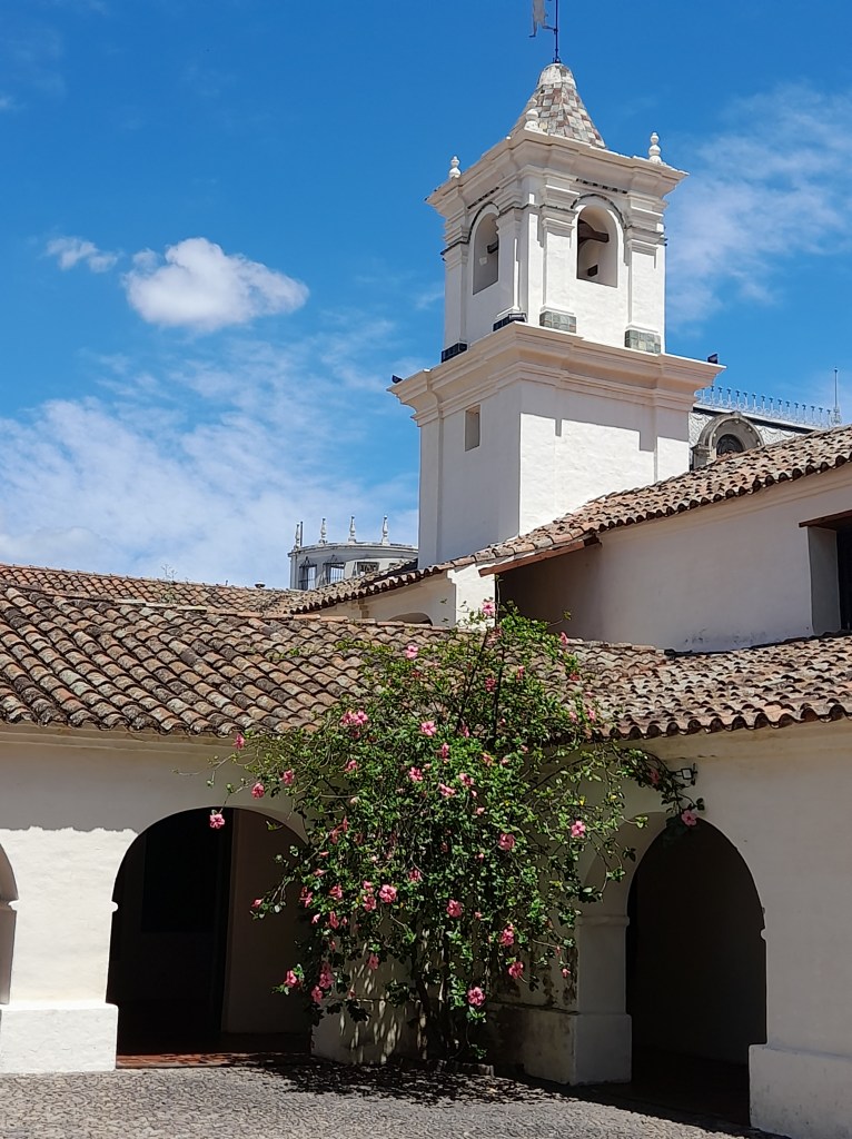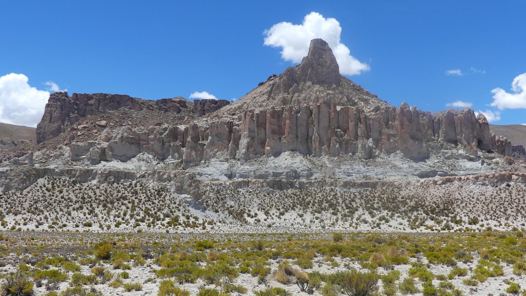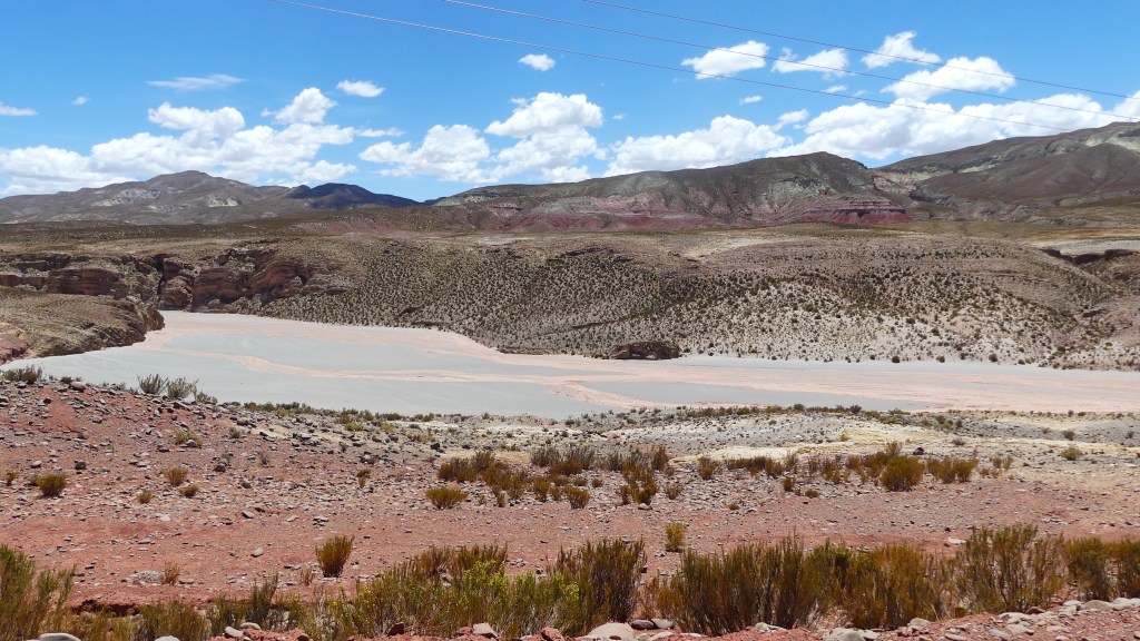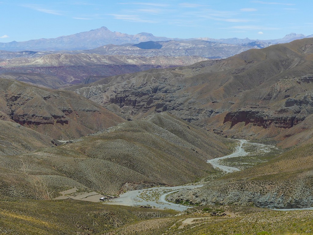 We hobbelen rustig door en stoppen regelmatig om (te veel) foto’s te nemen. Wijdse vergezichten wisselen zich af met smalle doorgangen, zoals door de kloof ‘Cañón Colordo’ bij San Juan Oros. Heel slechte weg, maar prachtig! Grote bloeiende cactussen maken de beleving compleet. We passeren een piepklein plaatsje met een witte kerk en gekleurde bergen in de achtergrond. Daarna rijden we door een vallei met een rivierbedding van gedroogde klei. Fascinerend! We maken bivak aan de ‘Valle de la Luna’, want dat staat op een bordje. In de namiddagzon maken we foto’s van de magnifiek roodwit gekleurde bergen. Als we de andere kant opkijken zien we Cusi Cusi in de vallei liggen. Wat een heerlijke plek. De paar voorbijgangers die we zien, stoppen voor een vriendelijk praatje.