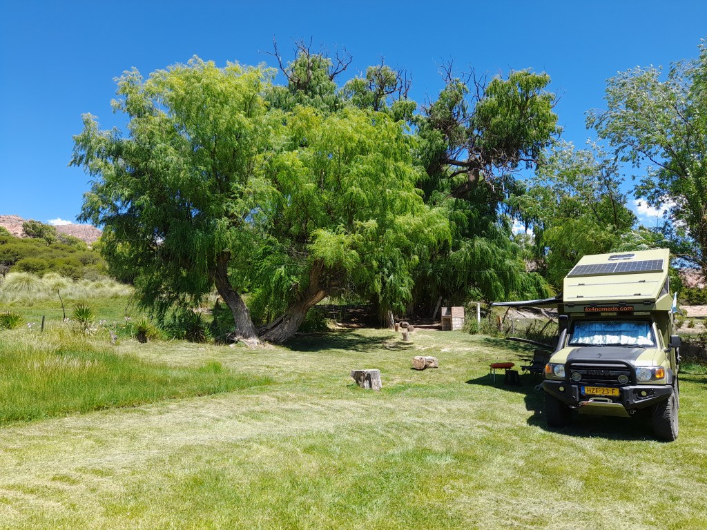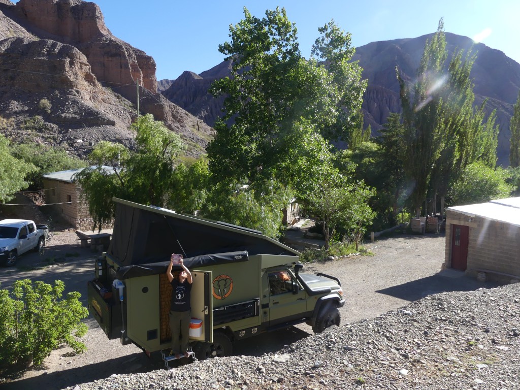 Het is al laat in de middag en we passen ons oorspronkelijke plan aan. We wilden graag de Ruta 83 en Ruta 73 te rijden, een 200 km lange tocht over dirtroads die heel hoog gaat, ver over de 4000 m. Daar zien we van af en rijden naar Purmamarca op 2400 m hoogte. Het idee is om langzaamaan te wennen aan de hoogte van de Andes. We slapen zo laag mogelijk en overdag gaan we de hoogte opzoeken. Het is inmiddels donker en we mogen in de tuin van camping Luna García staan.